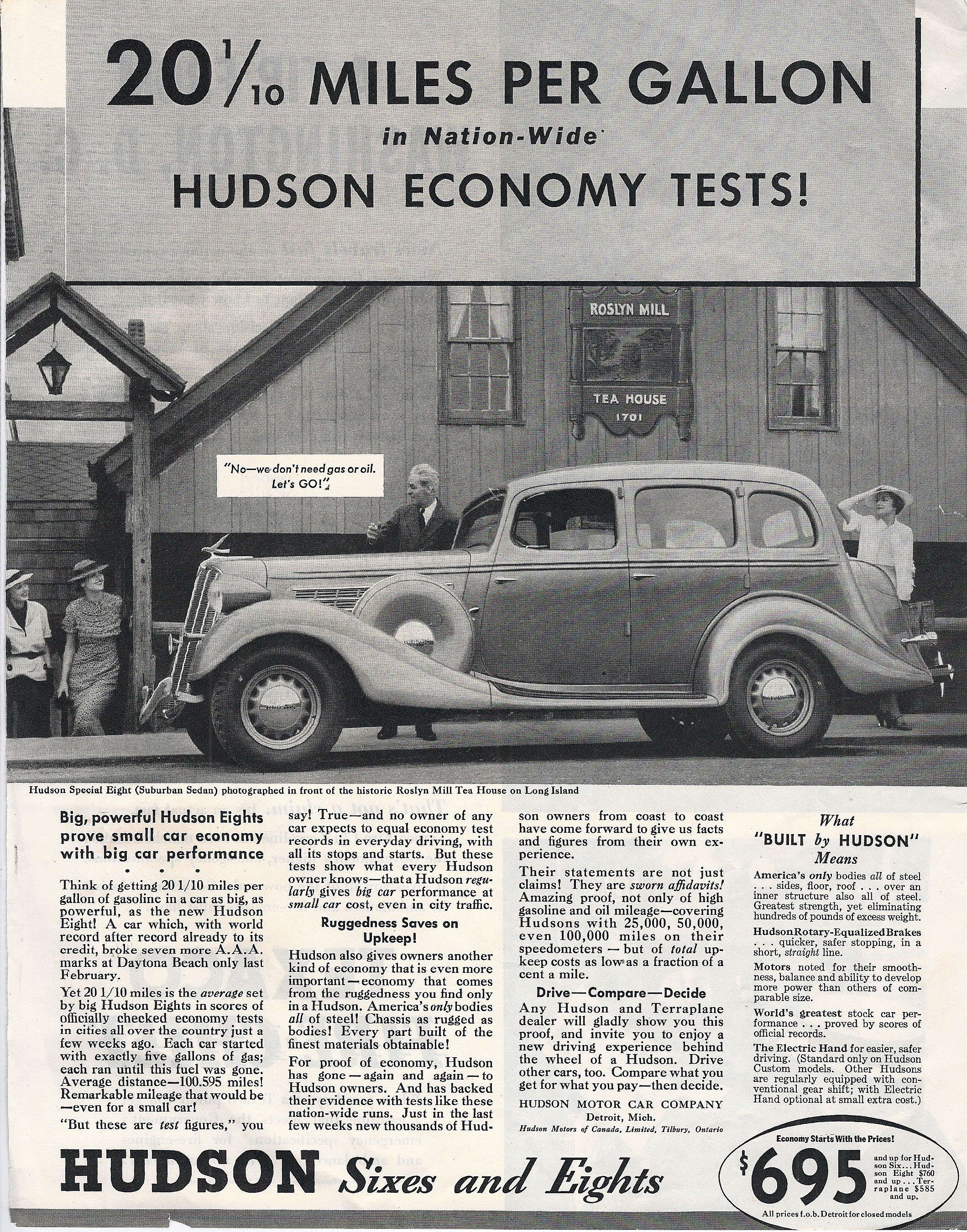 Please identify the manufacturer, model and year of the below two automobiles. Minor hint: The Roslyn Mill Tea House operated in this building from 1920 to 1974.