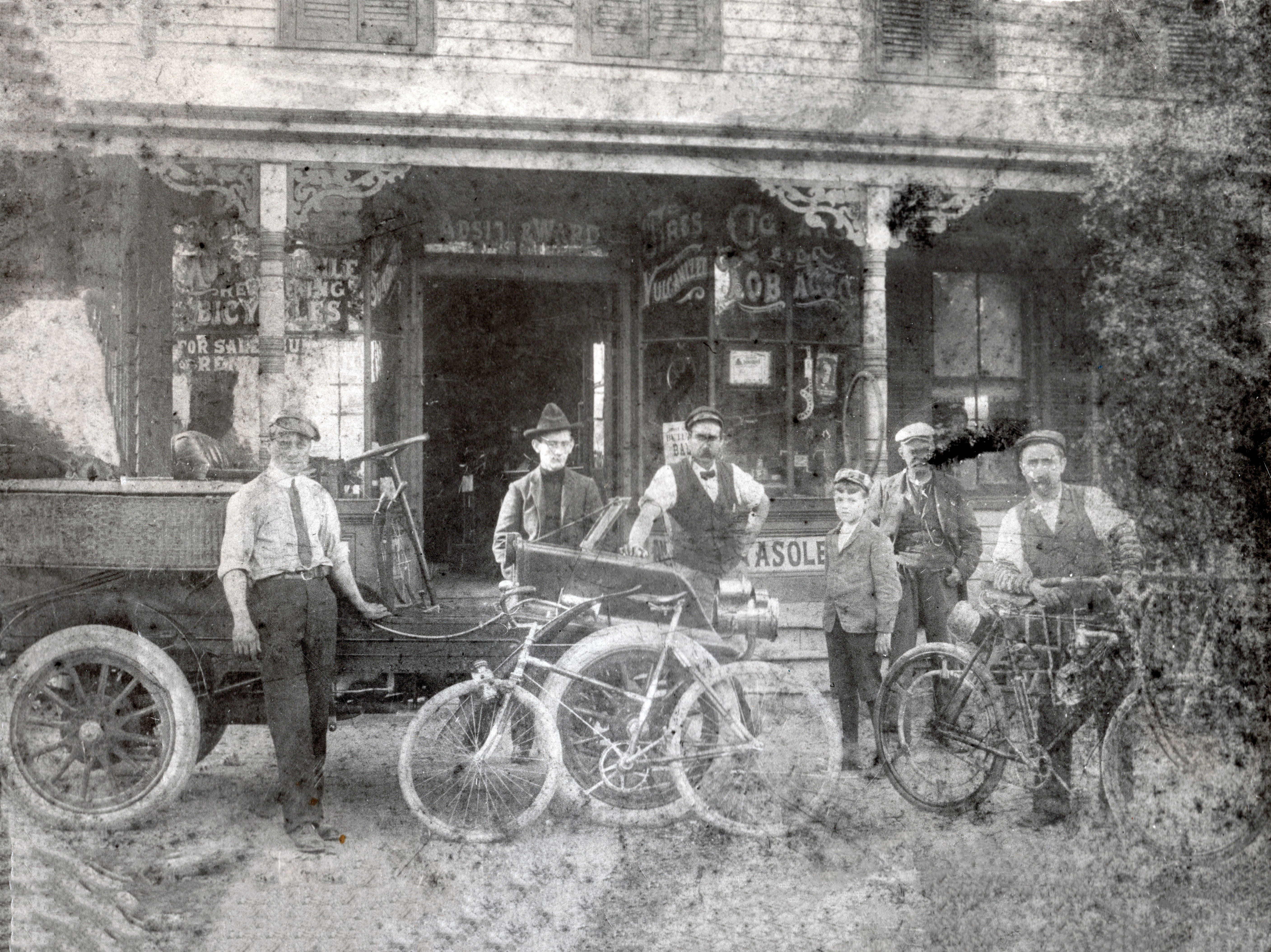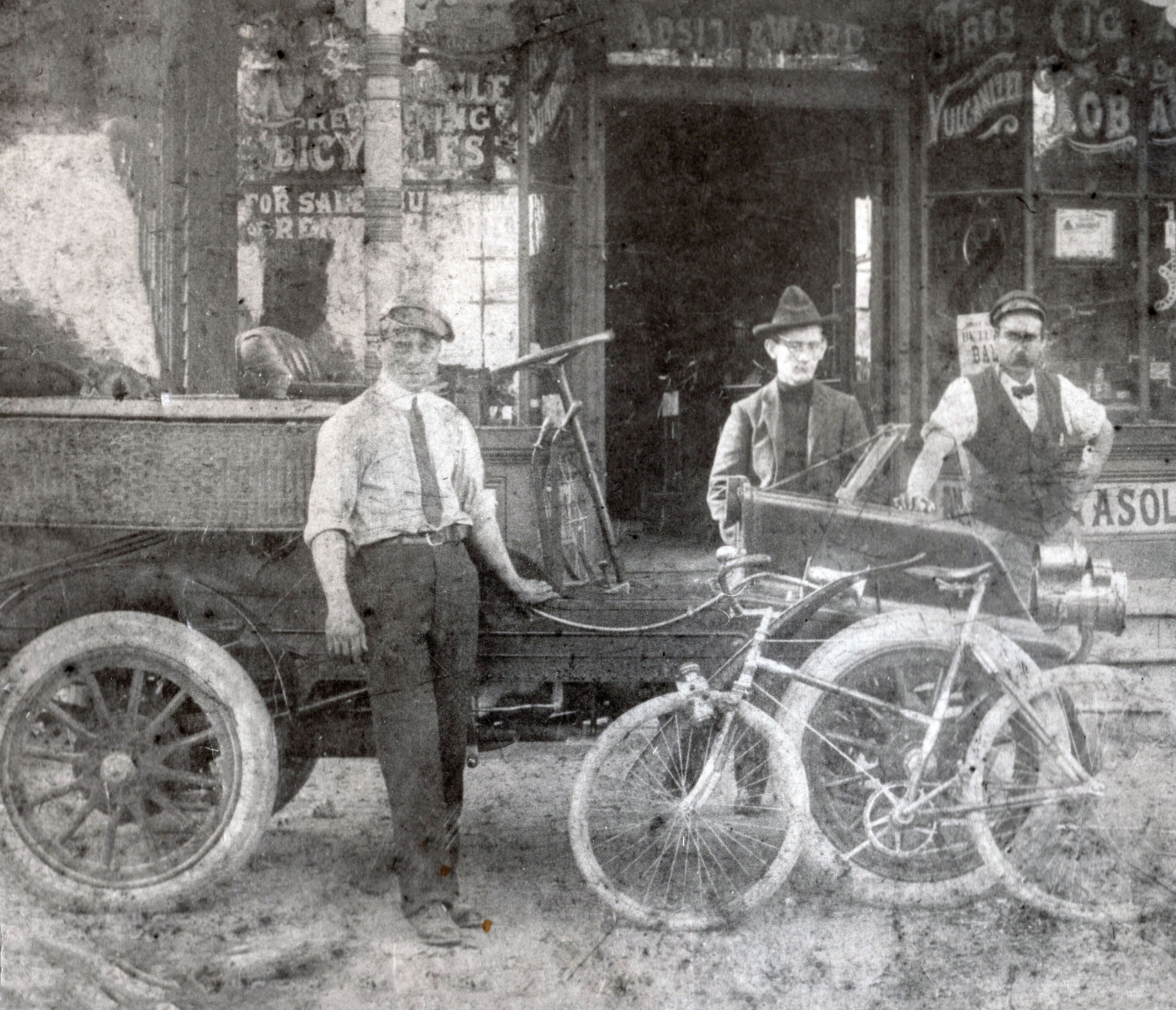 I’m guessing the car could be early 1900’s Cadillac or Packard,but is more likely a Winton.No clue as to the location,Mineola bike store??? LOL