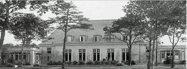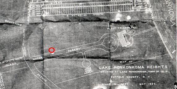 Approximately where the red circle on the1925 blueprint of the four- acre property of the Petit Trianon and the termination point of the Motor Parkway was the location of my parent’s home. The rest of the streets, North Drive, South Drive, Washington Avenue, Lincoln Drive and Marion Drive did not exist at this time. This last section of Motor Parkway was renamed Lake Drive. Also in the photo is the Petit Trianon on the far right and the building labeled the “Annex” (located lower center), which housed the staff.