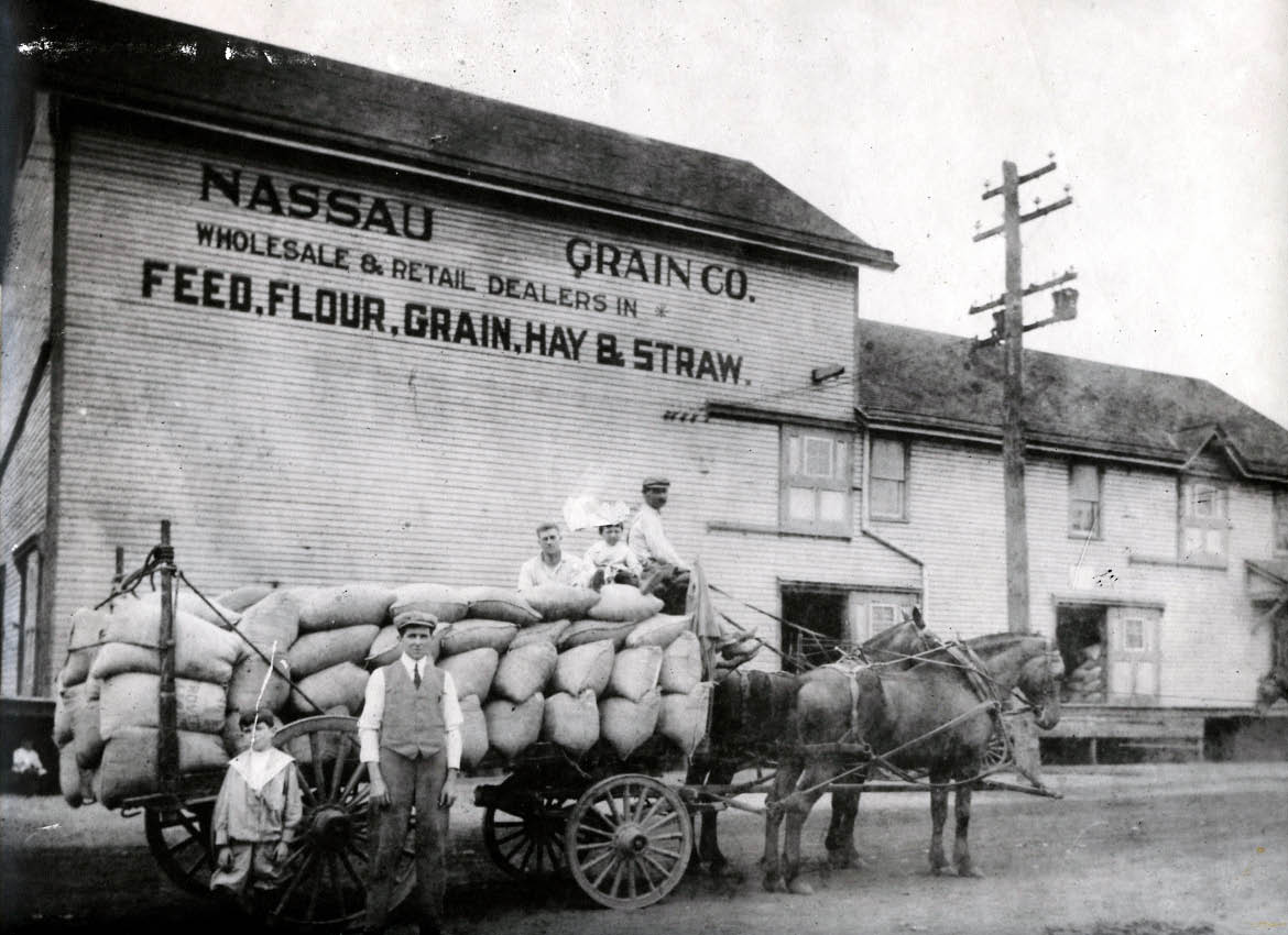 The Nassau Grain Company operated by Jeremiah S. Hennessy. It was located on Round Hill Road on the current site of St. Mary's Parish Center. Circa 1920. Photo Credit: Village of East Hills Archives.