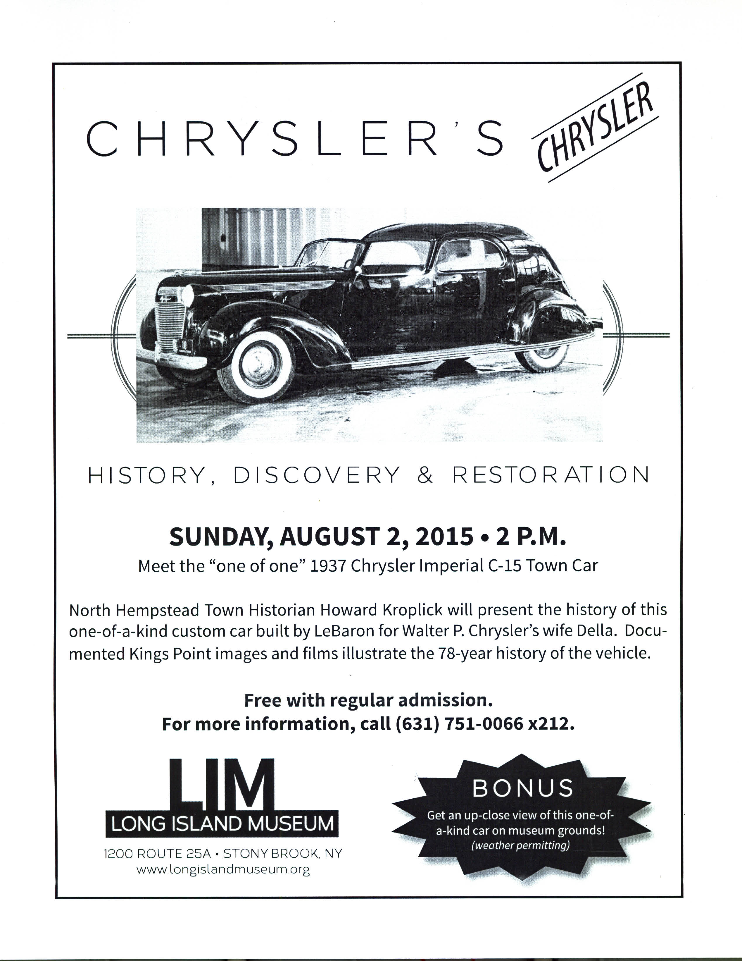 Kroplick has more information on the Long Island Motor Parkway, Vanderbilt Cup Races and 1937 Chrysler on his website at nwsdy.li/kroplick. For more information about the Long Island Museum event, call 631-751-0066.