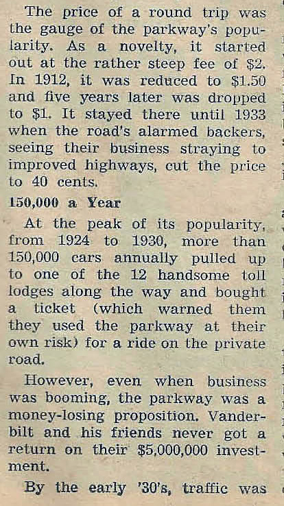 Great observation Brian! I knew something was odd/obvious about this photo but was unable to figure it out. YES, photo most likely taken from on top of one of the twin bridges! The elevation is about right and the parkway curving to the right down the road matches (~1000ft), towards the Meadow Brook Lodge and Bridge. As Howard stated this is a rare view of the stretch. Both bridges were taken down sometime in the ‘40s (late ‘40s?). Though the article was written in ‘51, the auto appears to be late ‘40s. Fantastic article, thanks Howard.
