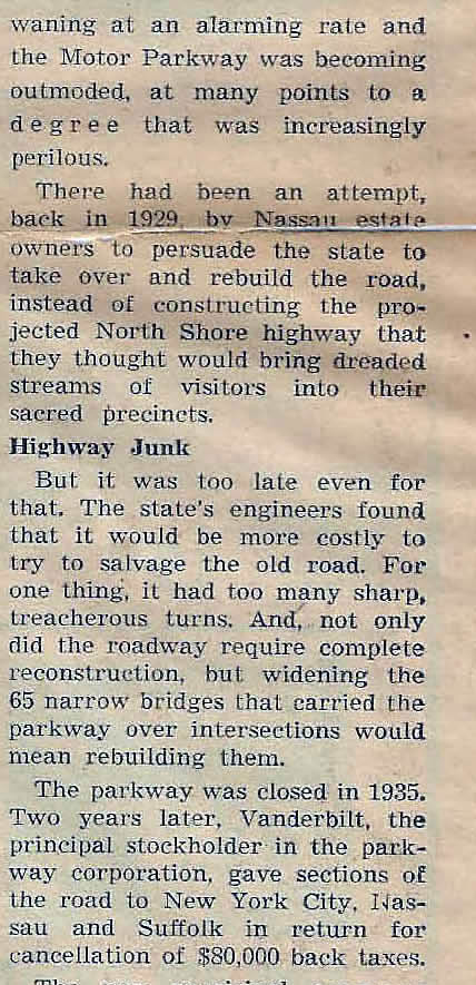Thanks for the Motor Parkway story. I remember when I was young having our Boy Scout leader taking us for hikes on it—we kept asking him if it would ever be opened again for cars.