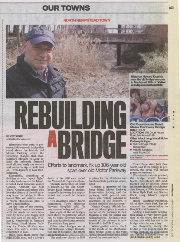 Just a quick hello and congratulations about the informative write-up featured in today’s Newsday….. about the old bridge overpass/ Motor Parkway