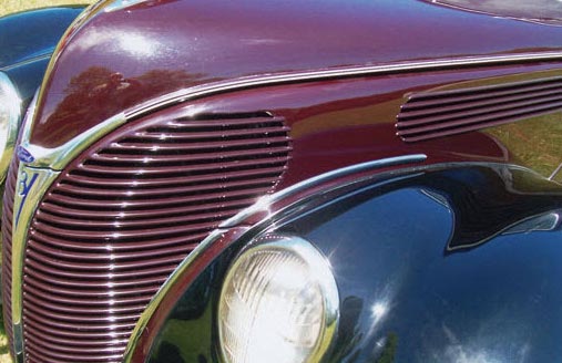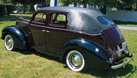 A roof covering that blanks out the rear side windows caps off the Vanderbilt 1938 Ford and adds to its elegance. The car lacks running boards and wears the fully plated wheel covers.