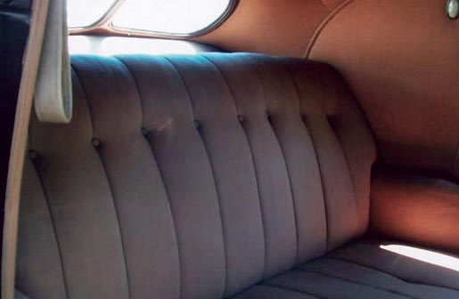 The plush broadcloth rear seat is flanked by blanked-out rear window panels carrying small lamps.