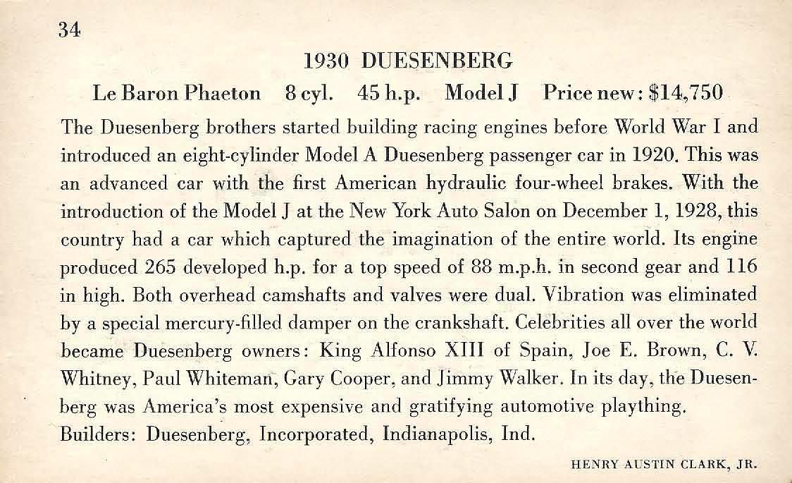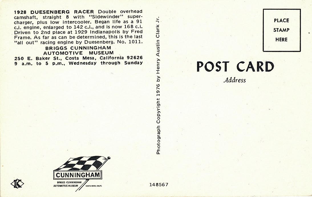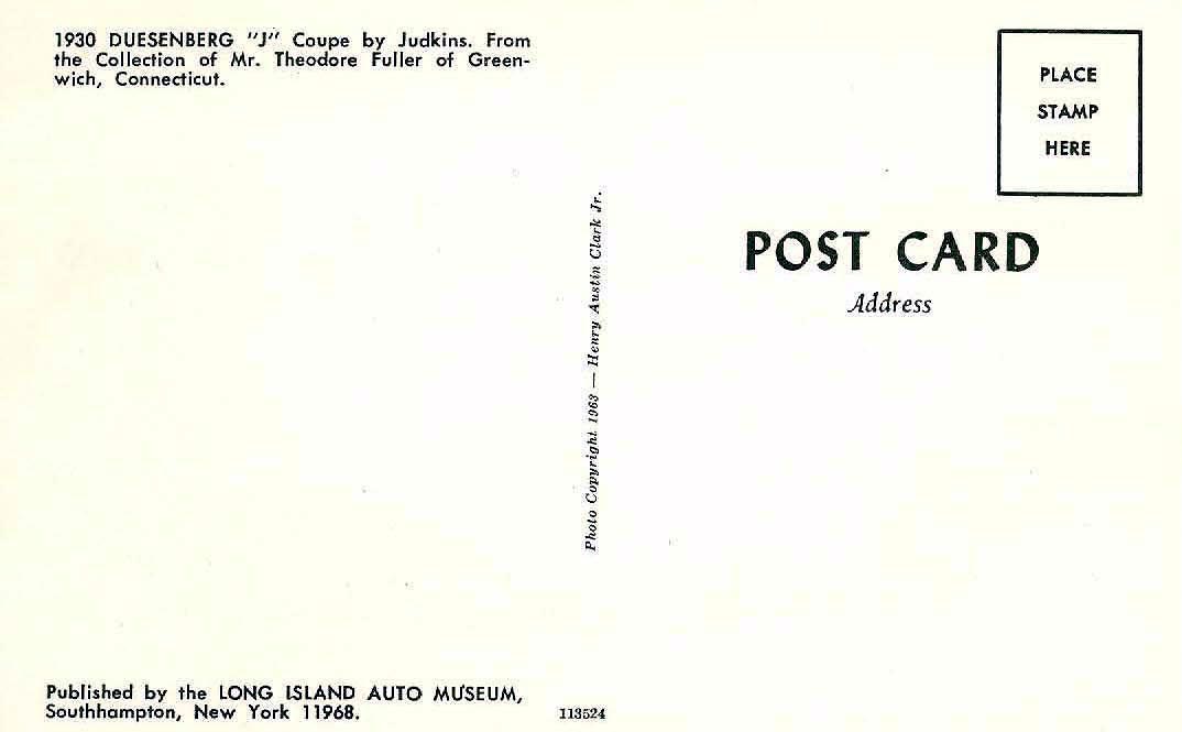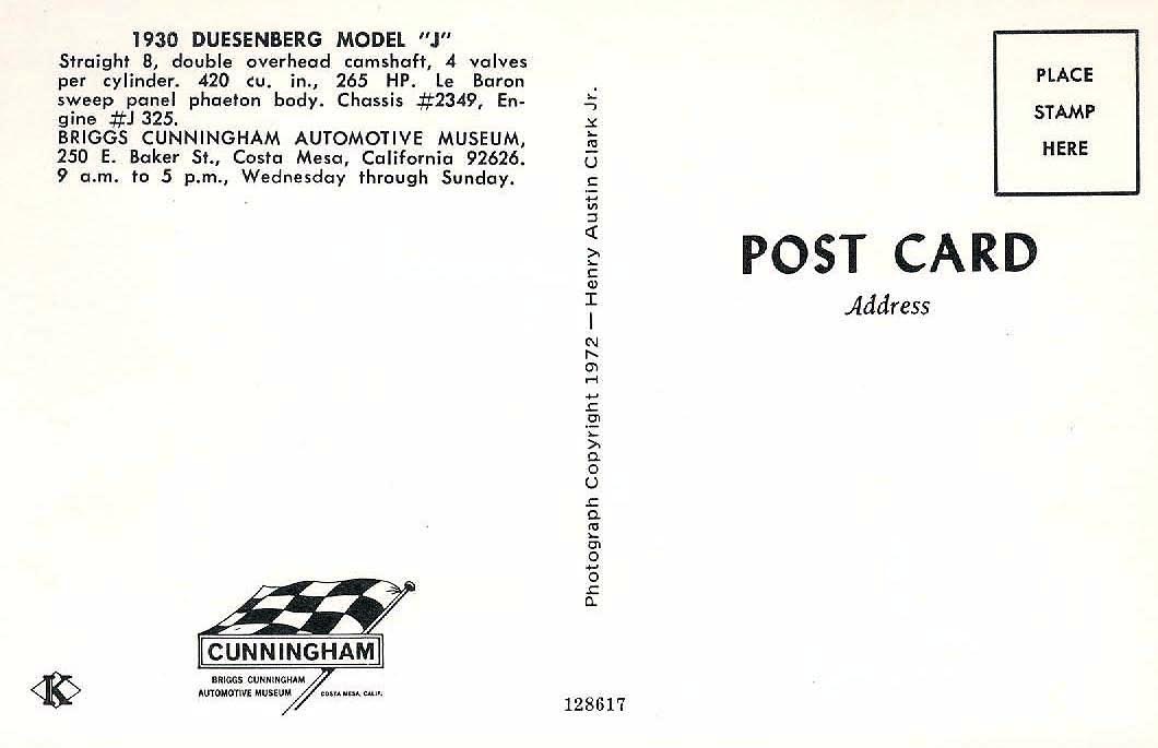 The Long Island Automotive Museum offered a wide array of related merchandise including; jewelry, label buttons, photos, model car kits, china and series of postcards. As described in this brochure , provided by Walter McCarthy, there were over 500 cars postcards published featuring the cars of "Henry Austin Clark, Jr. and other noted collections". Here are six Duesenberg (1929-1930) postcards: