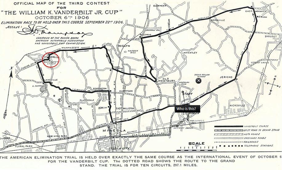 One of the most exciting locations to watch the 1906 Vanderbilt Cup Race was Manhasset Hill (Spinney Hill) located now at the intersection of Northern Boulevard and East Shore Road/Community Drive.