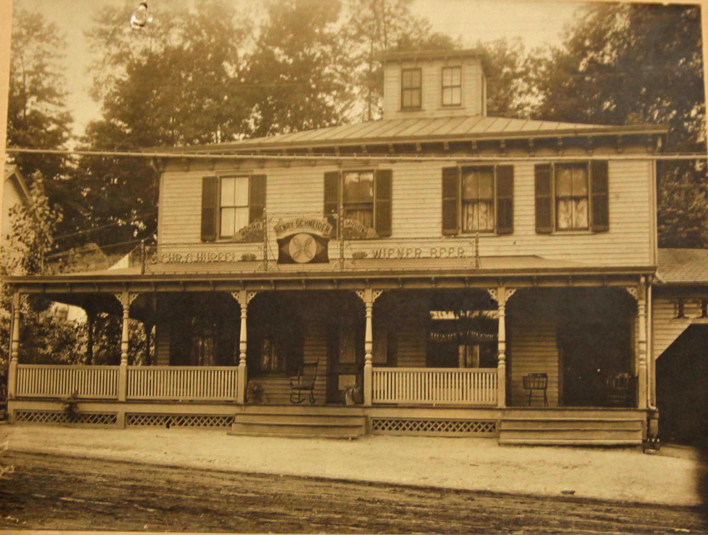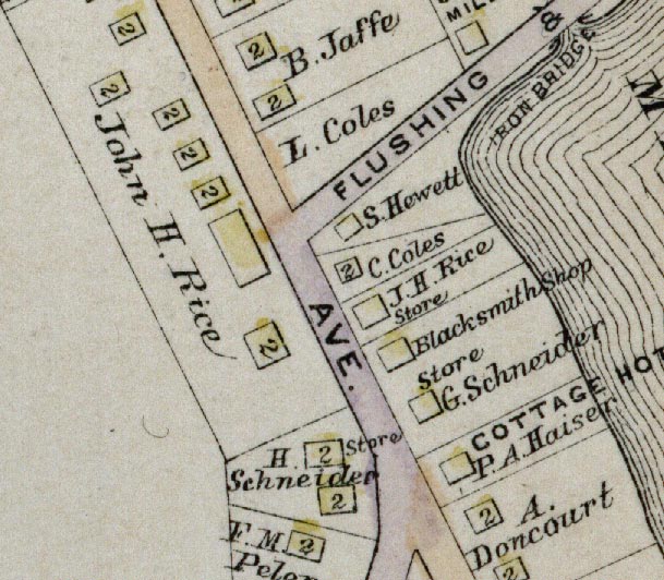 Stores lined both sides of the street including Henry Schneider's Store and a blacksmith shop.