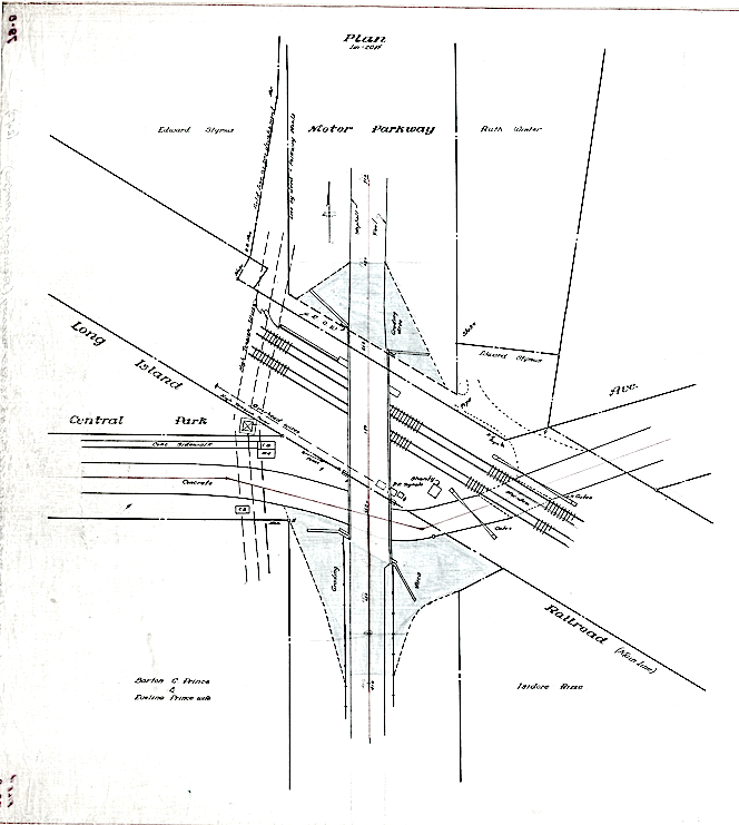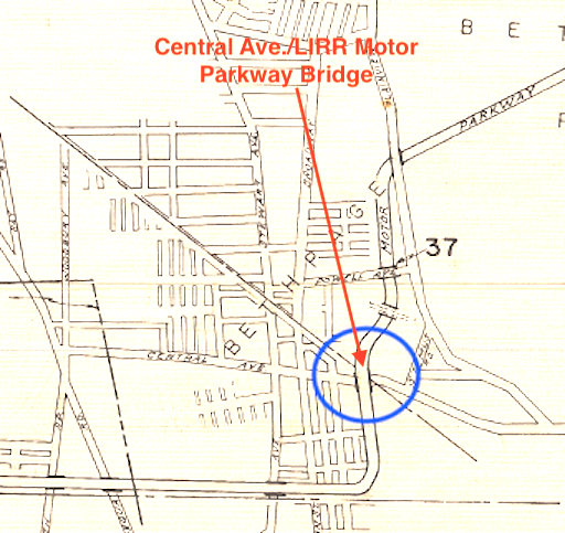 Art - Amazing schematics of the parkway and bridges; particularly the ‘Detail Plans’ showing Central Ave eastbound just before reaching the Motor Pkwy bridge, curving SE first, then immediately curving NE before crossing the RR tracks. I remember this twist took a while to figure out using the 1926 aerial below. Here it is now accurately drawn in plain sight! Great stuff, thanks for sharing