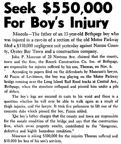 The accident resulted in a lawsuit filed against Nassau County of which final disposition has not been found. Anyone with further documentation or thoughts as to when the bridge and abutments were actually removed, please comment.