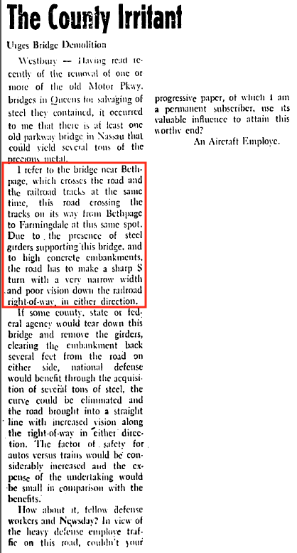 As early as 1942 at least one local resident sought the bridge's removal for safety reasons and to aid the war effort. (Newsday, August 19, 1942)