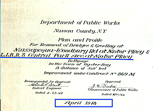 Nassu County Contract No. 869 M reflected the "Plan and Profile for the Removal of Bridges and Grading at" two Motor Parkway bridges (Massapequa-Woodbury Road and the Central Ave./LIRR bridge). (Nassau County Public Works)