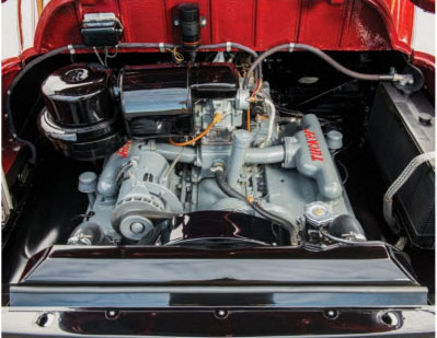 Returning 1046 to its original form was a painstaking process, involving sourcing an original Tucker engine, cord transmission, “new-old-stock” dashboard, and complete interior, as well as many miscellaneous parts, done through careful research and dogged pursuit. All of the original stampings are present, and all of the body panels are original to this car. Most impressively, the original underbody was reproduced by digitally scanning the original floors and support extensions of Tucker number 1047, then having a precise duplicate cut by water jet, as would be done to restore a car with a rusty underbody. Even the rough-looking welds found on 1047’s original underside were reproduced on this car to make it factory-correct in all regards. An original spare Tucker engine, no. 335-55, was sourced and fitted. A gas tank and front trunk tub were fabricated, along with the entire floor and parts of the correct Torsilastic suspension; several of the parts that were used in the restoration actually came from 1046 originally. The Maroon paint was digitally matched to traces of original factory finish, under the fender rubber welting and glovebox door.