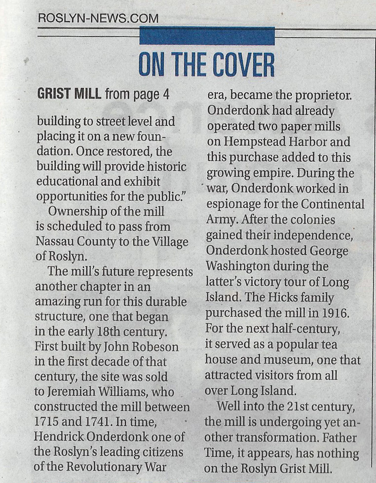 Below are the latest news articles on the Roslyn Landmark Society and the Roslyn Grist Mill Project.