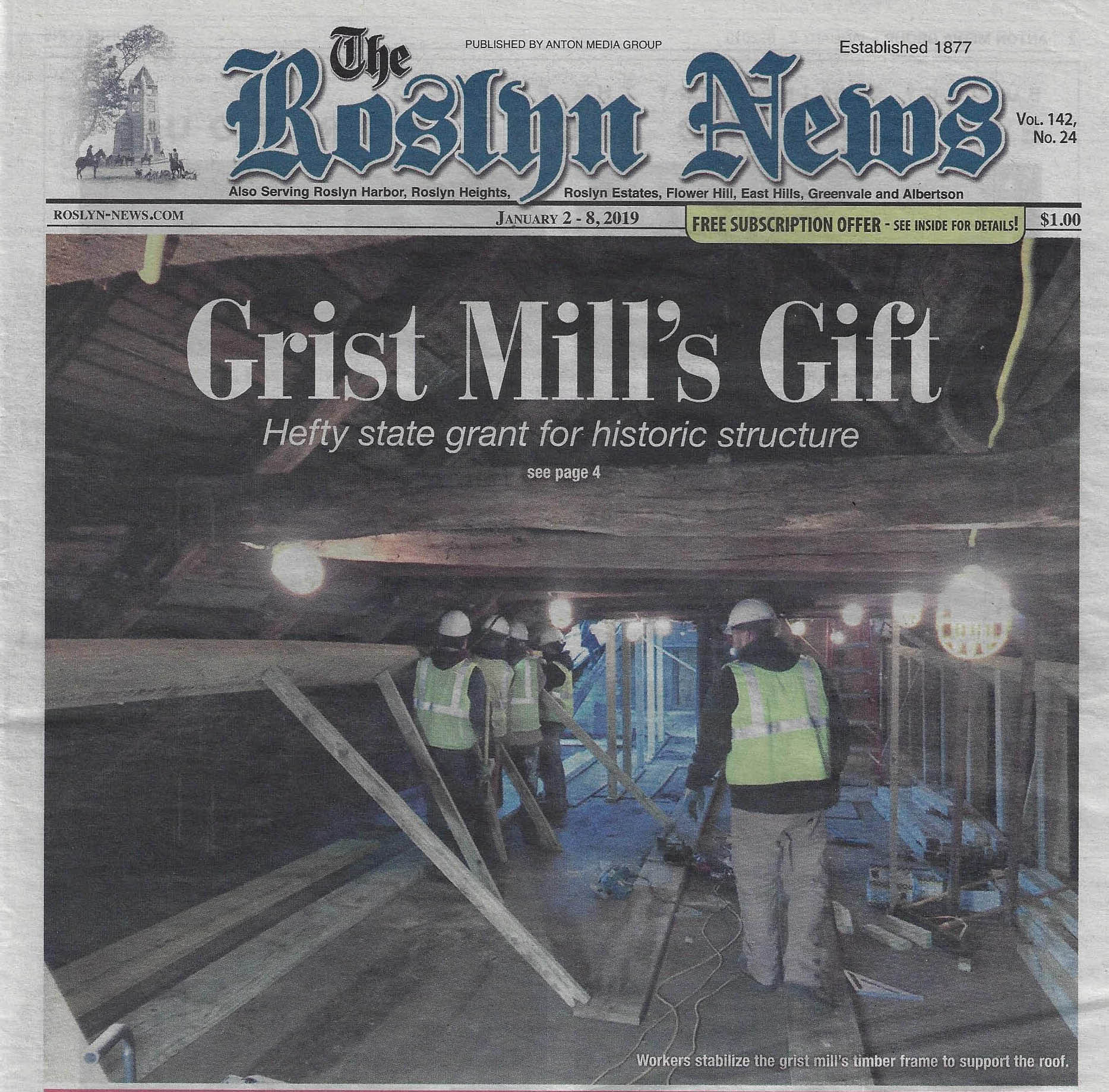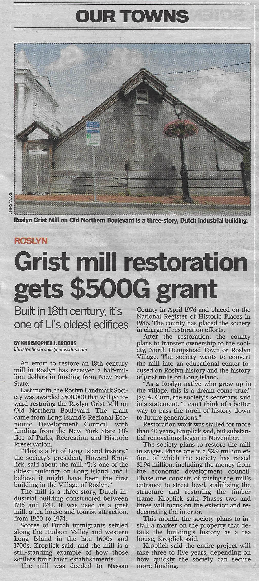 Roslyn Times, "Grist mill restoration project gets $500K state grant"