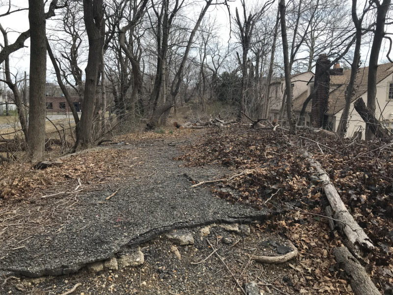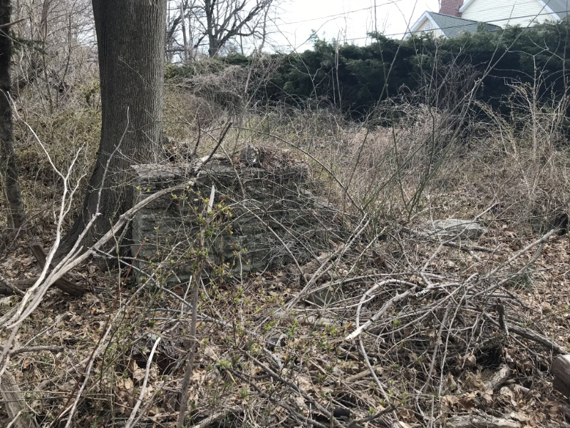 A portion of this wall across the road remains. It was built to keep automobiles off the Parkway after the bridge was demolished around 1939. There used to be more of this wall just a few years ago.