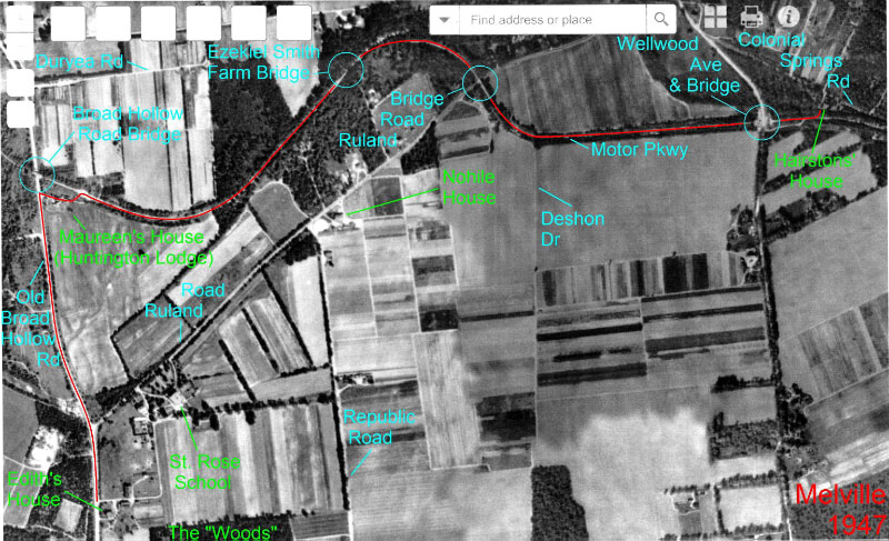 Based on the 1947 aerial, of the three bridges you had to cross to reach the Hairstons’ (not including the Brush Hollow Rd bridge), two were still intact and appear passable (the Ezekiel Smith farm bridge by Maxess Rd, and the Ruland Rd bridge). The one bridge that appears to have already been removed was the Wellwood Ave bridge (Pinelawn Rd), just 500 feet short of your destination.
