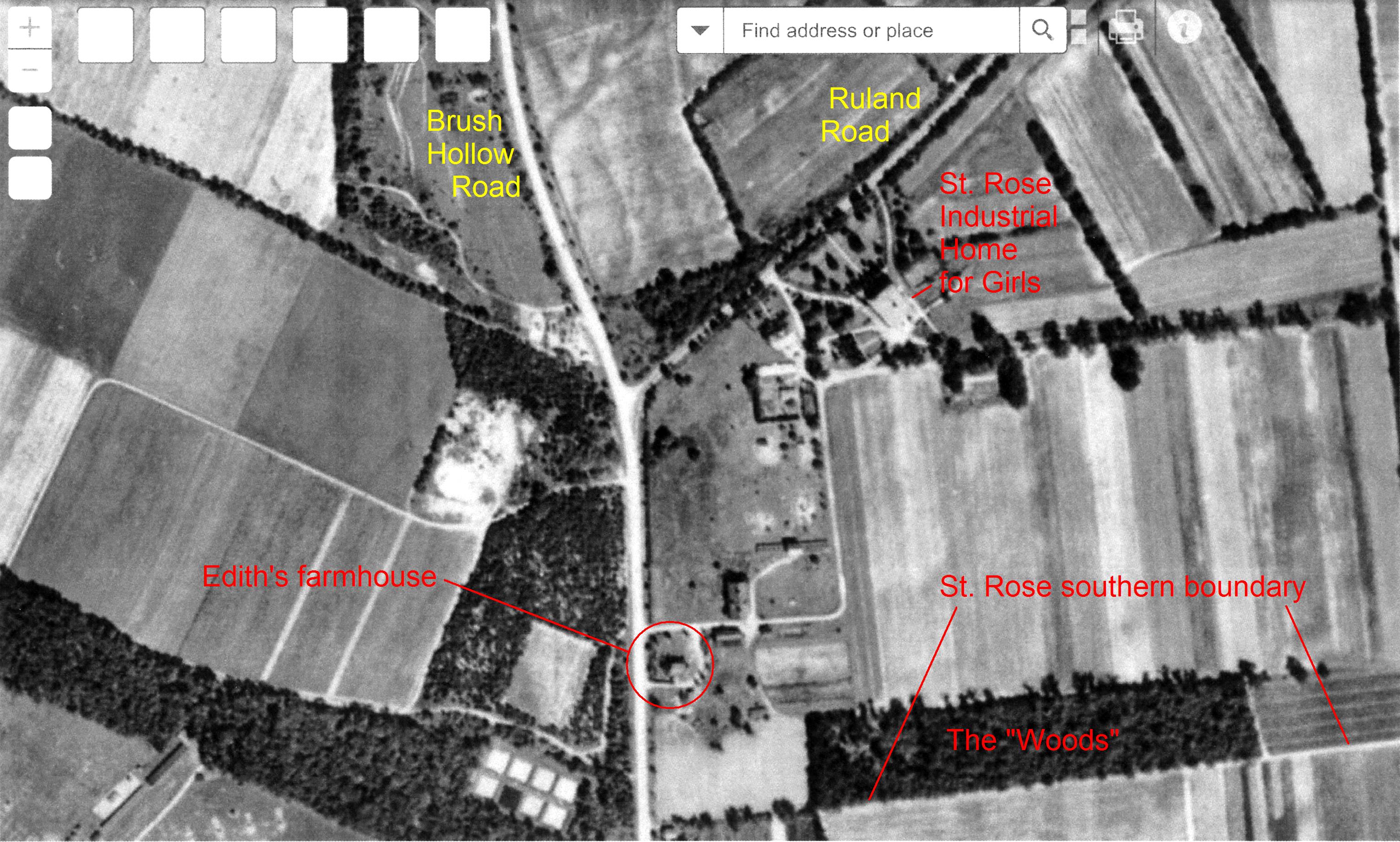 Dave- Edith’s childhood farmhouse was south of Ruland Rd and just north of the Huntington town line (first house in Huntington). The earlier aerial sent was for the two locations of the Huntington lodge (1930, 1947) just to the north of Edith. After the lodge was moved from its original location to the south in 1947, it became Maureen’s childhood home in the lodge.