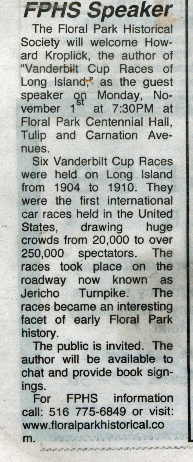 The Floral Park Historical Society will welcome Howard Kroplick, the author of "Vanderbilt Cup Races of Long Island", as the guest speaker on Monday, November 1st at 7:30 PM at Floral Park Centennial Hall, Tulip and Carnation Avenue.