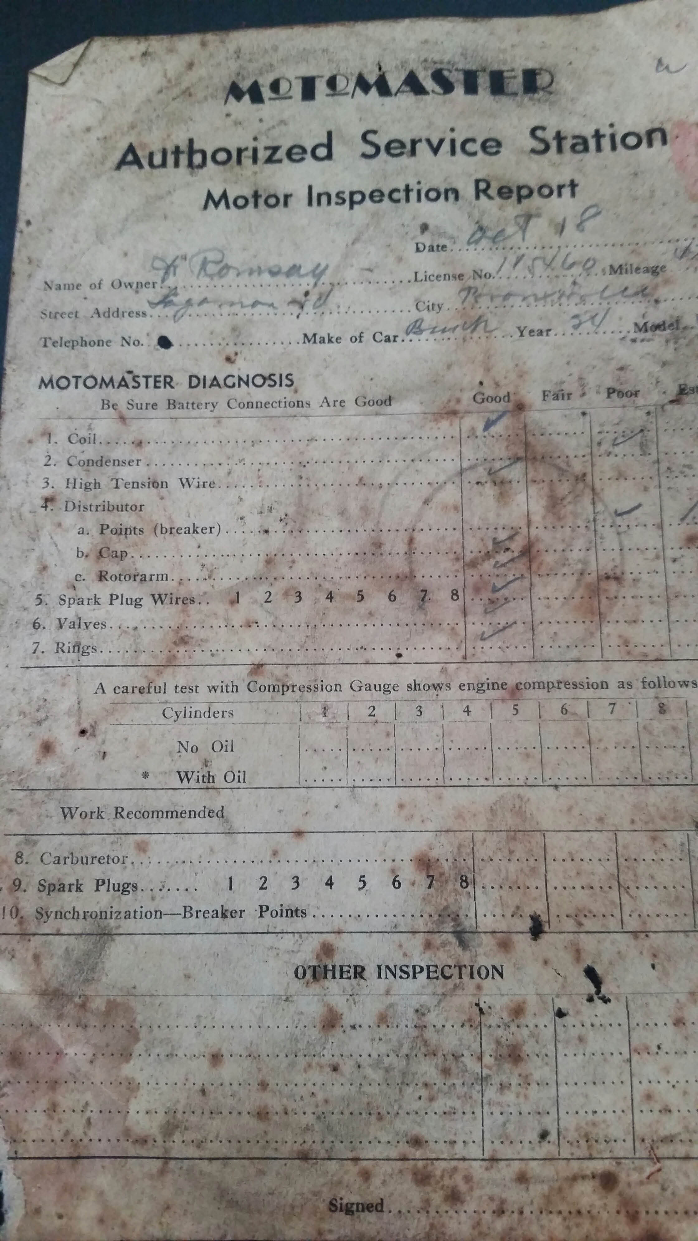 Greg Peppler: "Hi Howard, I have a question that I'm hoping you can help me with. I have a automotive tool that I believe was built in 1933. It's called a Motomaster. I can not find any information about it on the internet. I've asked a local mechanic if he has ever seem one, he told me that he has not. I have attached photo's of the tool , some information from the owners manual also, a receipt from a customer that owned a 1924 Buick. Any information that you might have would be greatly appreciated. Thank You."