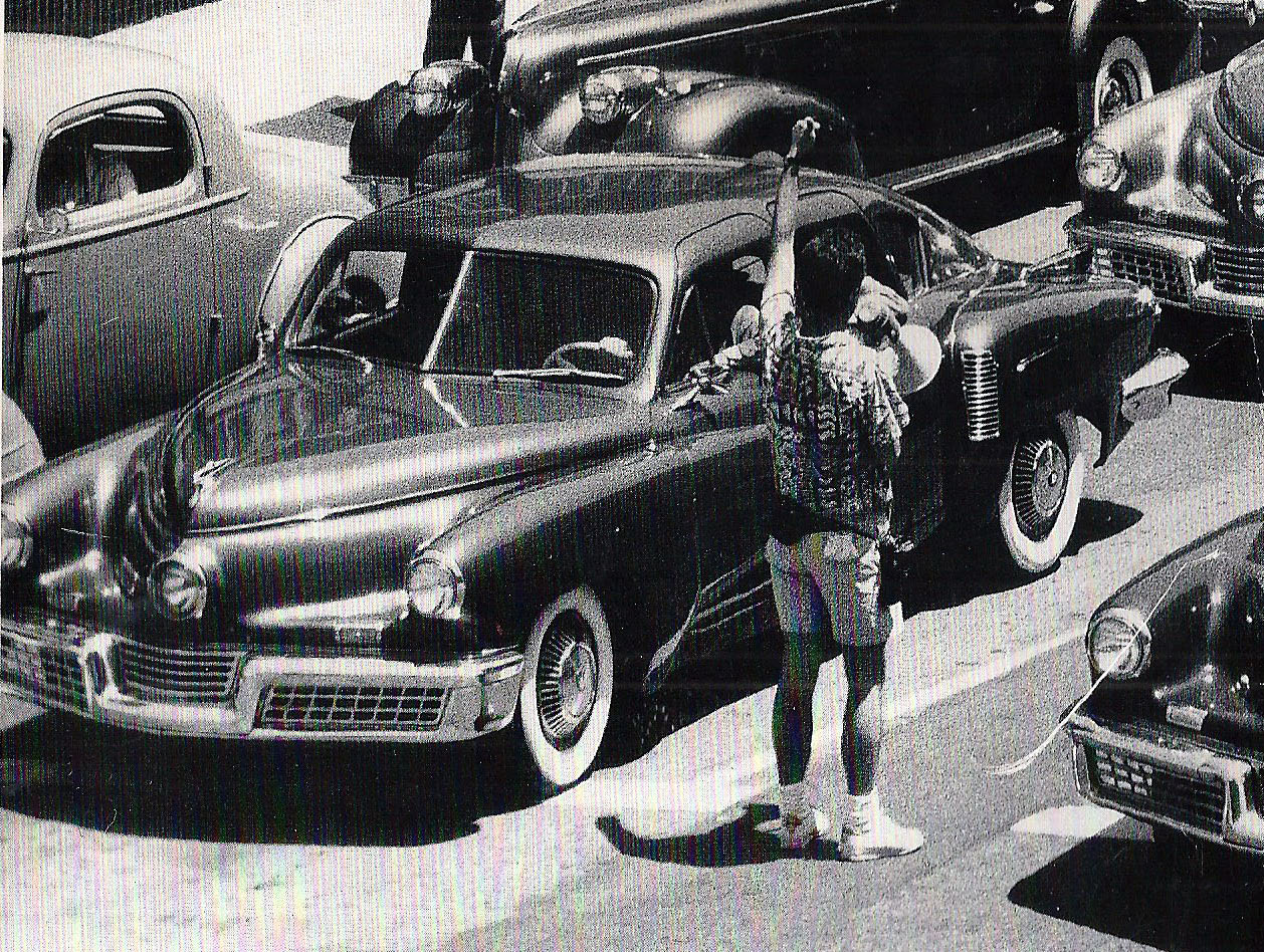 To hell with all those Tuckers - love !hat ‘46-48 Ford woodie! Seriously, though, what’s the black rectangle off-center in front of the Tucker ‘way back at the curb? Sam, III