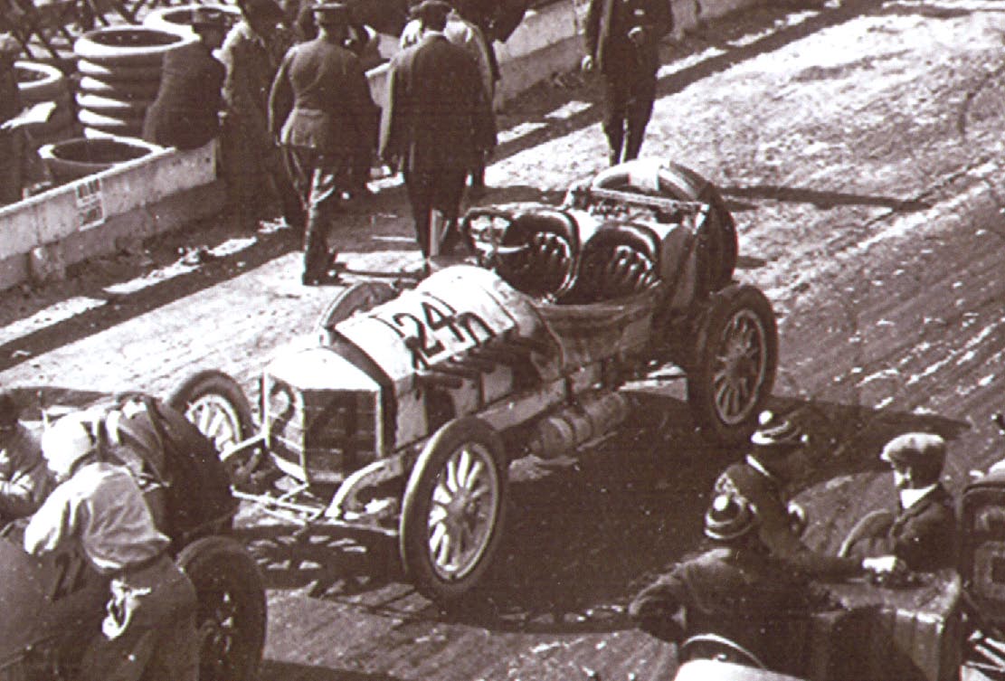 #22 Mercedes driven by Ralph DePalma (driver) and Tom Alley (mechanician). Finished first, completing 38 laps and averaging 68.962 MPH.