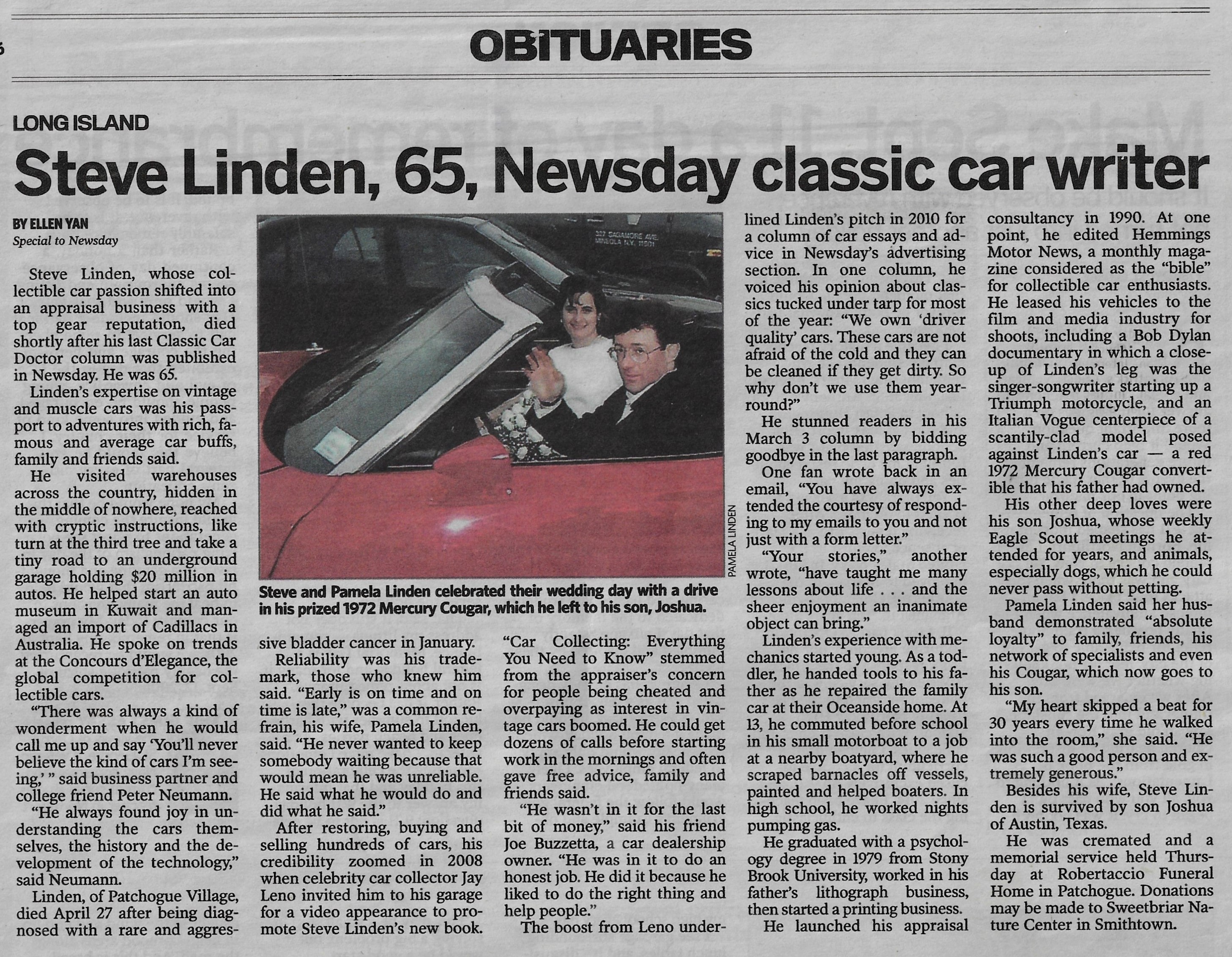 Linden’s expertise on vintage and muscle cars was his passport to adventures with rich, famous and average car buffs, family and friends said.