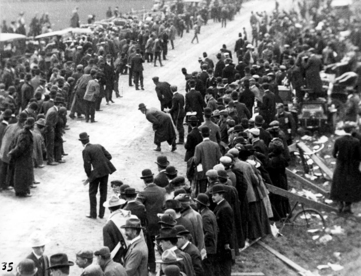 Spectactors standing near the grandstand could not resist strolling on the course during the 1904 race. The absence of crowd control would remain a problem for all Vanderbilt Cup Races held on Long Island.