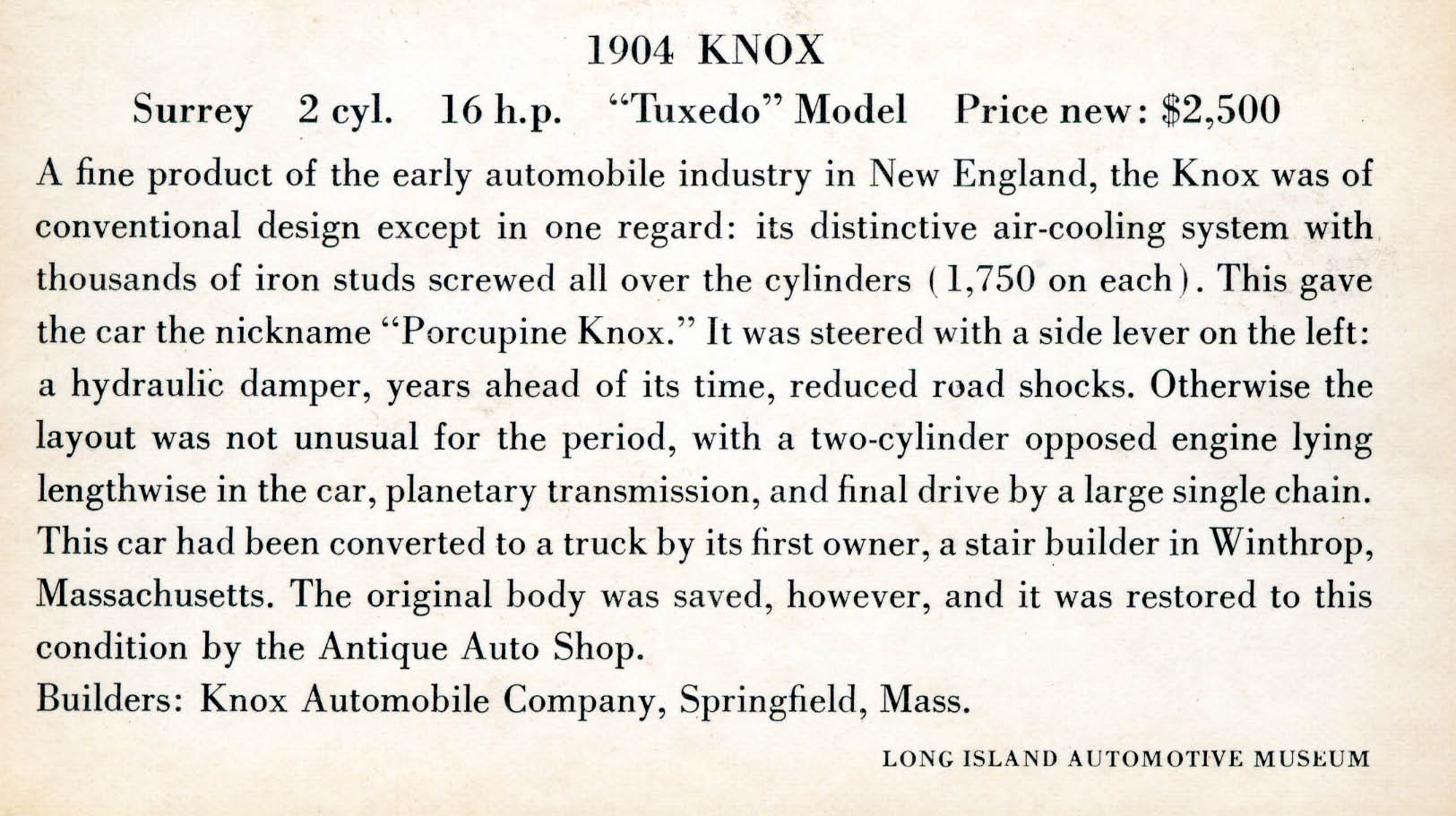 I think the 1904 Knox is in our collection at the Seal Cove Auto Museum. The only notes I have say that our car was built for Harry A. Knox, President Knox Automobile Company. Same model, same color… sure looks to be the same car. Unfortunately, when Richard C. Paine Jr., the Museum’s founder, died he took most of the information about the cars to the grave with him… trying to establish their provenance is proving an interesting challenge!