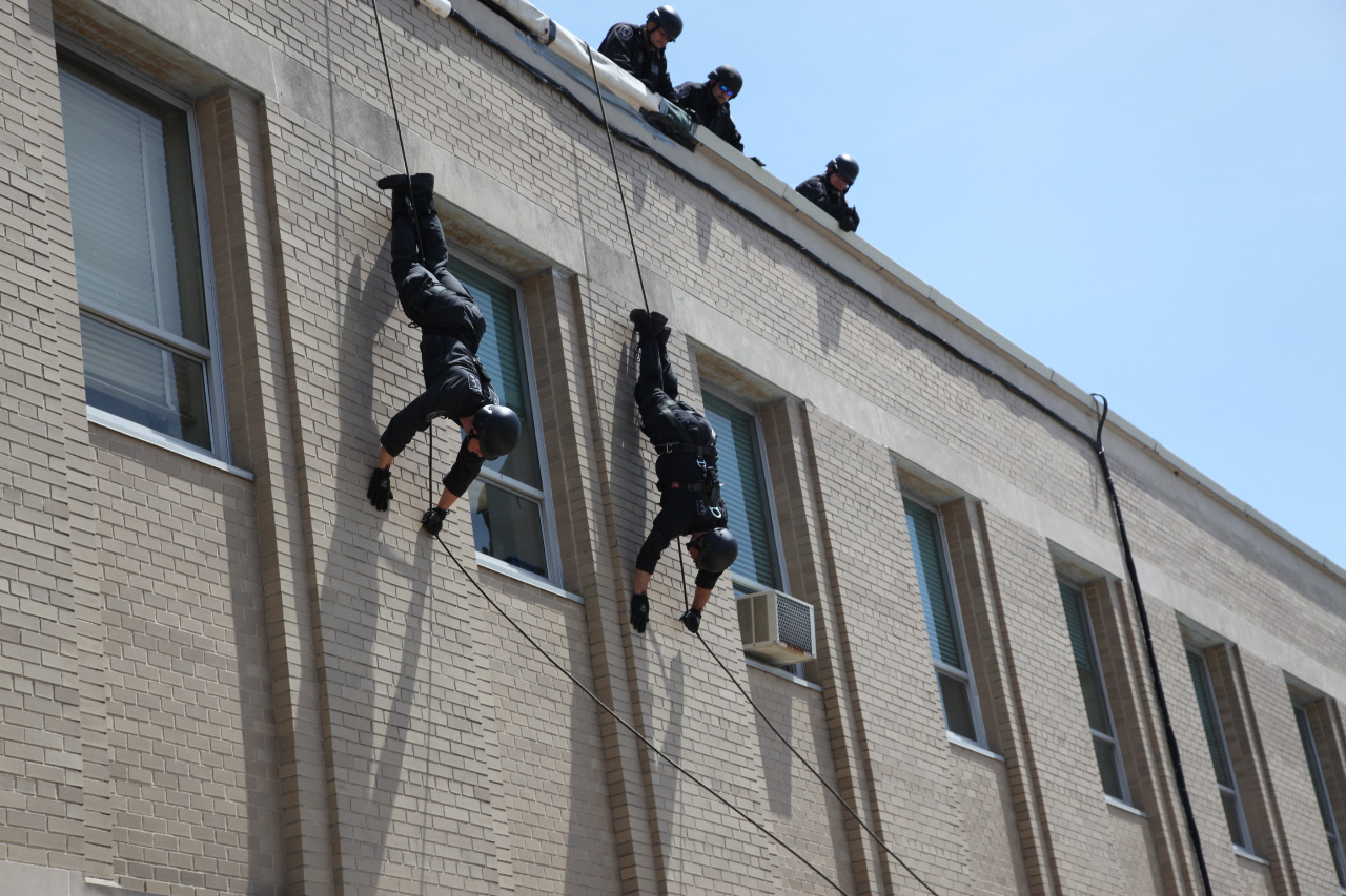 The Bureau of Special Operations conducted a head-turning rappelling display on the police headquarters buidling.