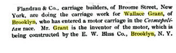 The carriage work for the Grant was done by Flandrau & Co. of Broome Street, Manhattan. The 8-HP gasoline motor was invented by W. Wallace Grant and built by E.W. Bliss Company of Brooklyn.