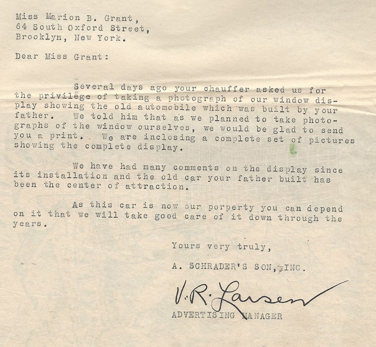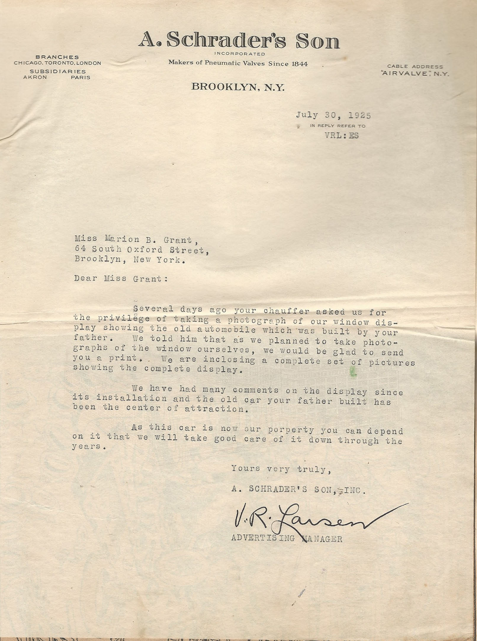 Following the 1925 Brooklyn Automobile Show, the Grant was displayed at valve-maker A. Schrader's & Son located in Brooklyn. This letter was sent to W. Wallace Grant's daughter Marion Grant.