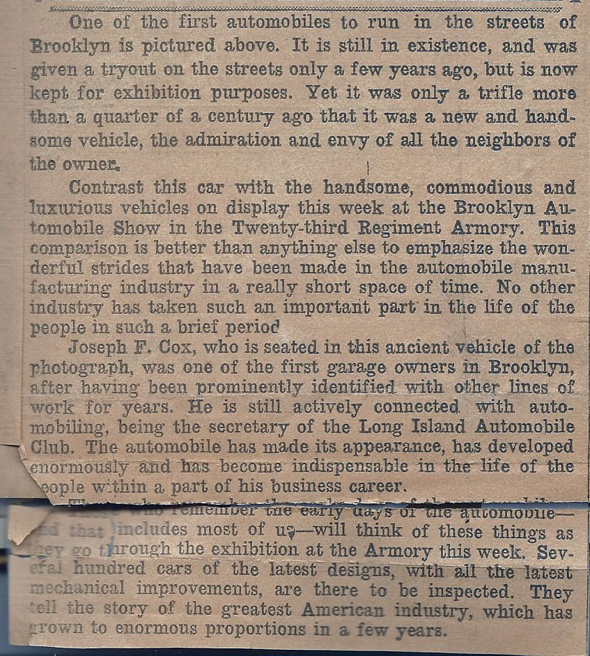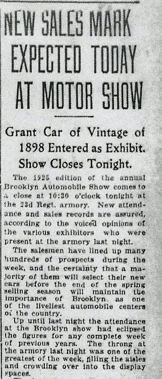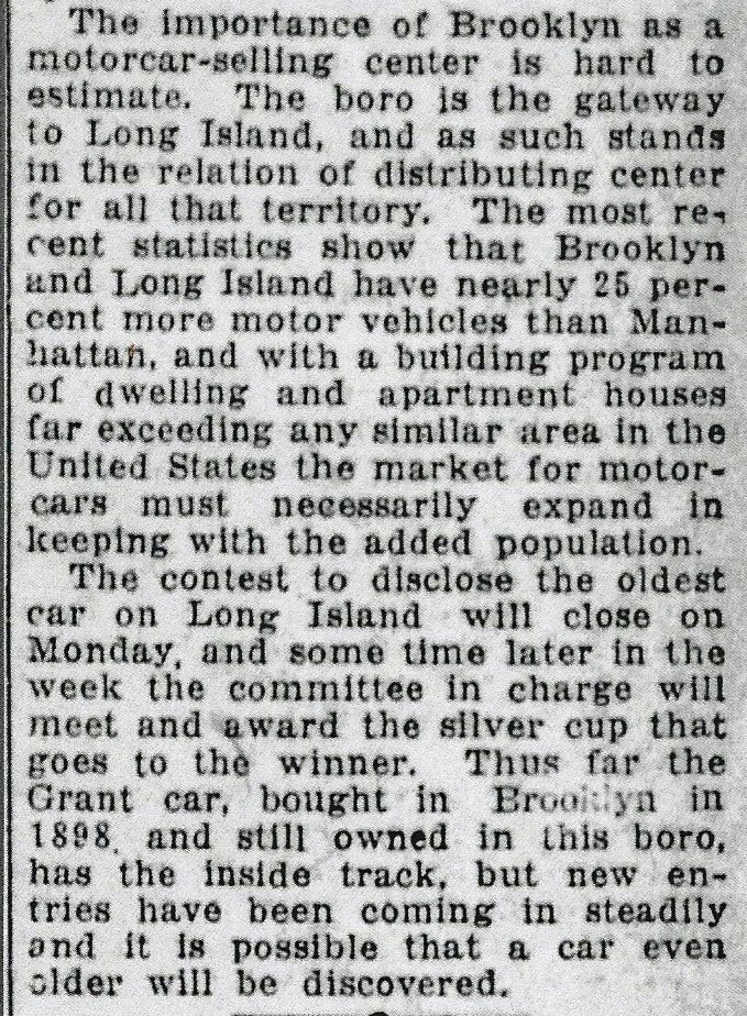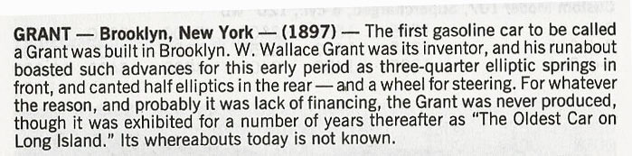 At the 1925 Brooklyn Automobile Show, a contest was held to locate the "oldest car on Long Island." The winner was a 1897 Grant created by W. Wallace Grant, the former president of the Long Island Automobile Club.