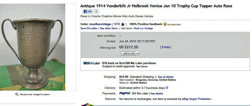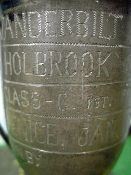 The copy on the trophy reads:" Vanderbilt Holbrook Cup Class-C 1st Venice Jan. 10-14 Won By." The Mayor of Venice was C.W. Holbrook and the "pushmobile" races were held on January 10, 1914.