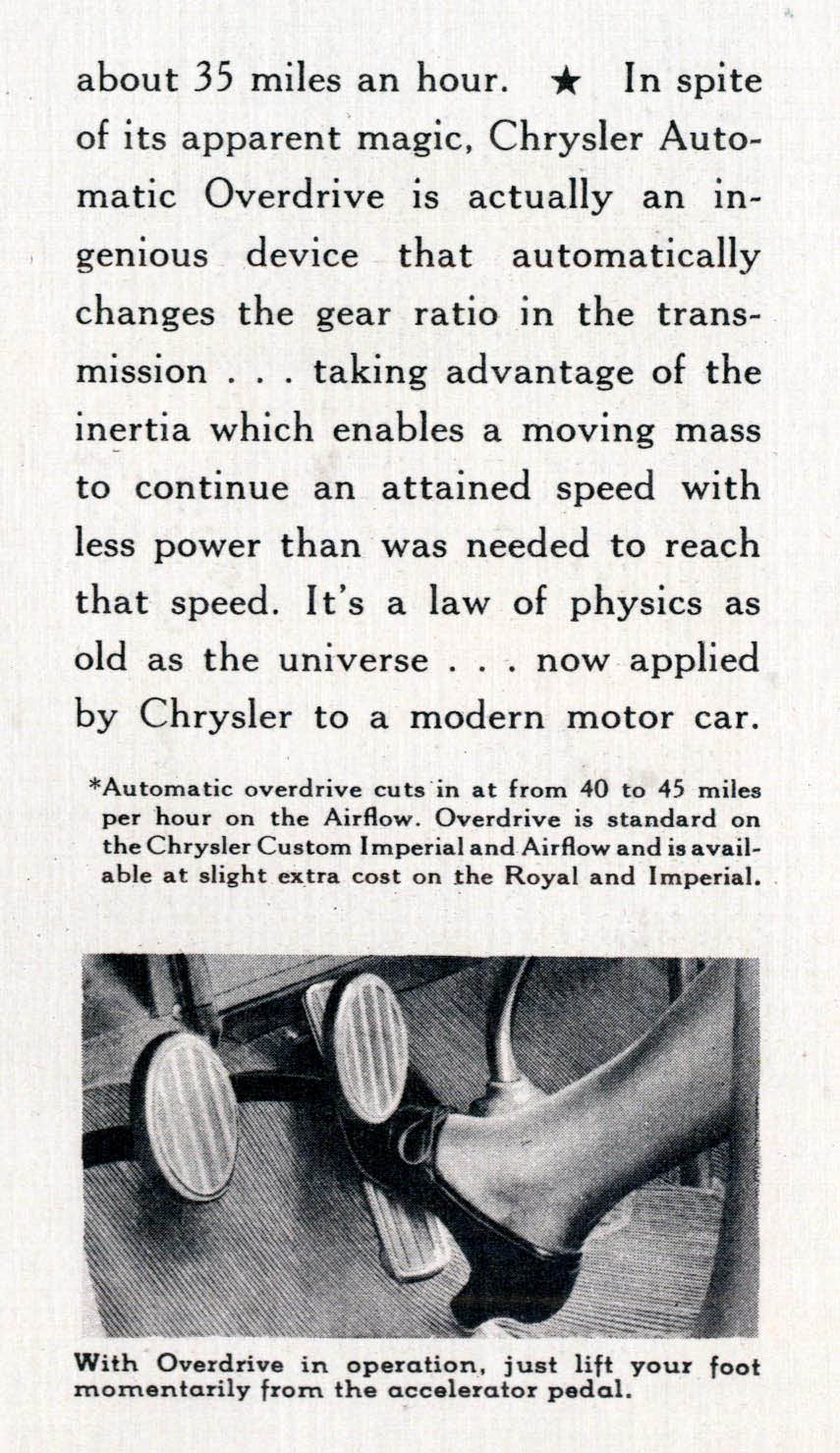 A standard feature in the 1937 Chrysler Custom Imperial, including Chrysler's Chrysler, and the Airflow was the Chrysler Automatic Overdrive. For an extra cost, Automatic Overdrive was also available on the Royal and Imperial models.