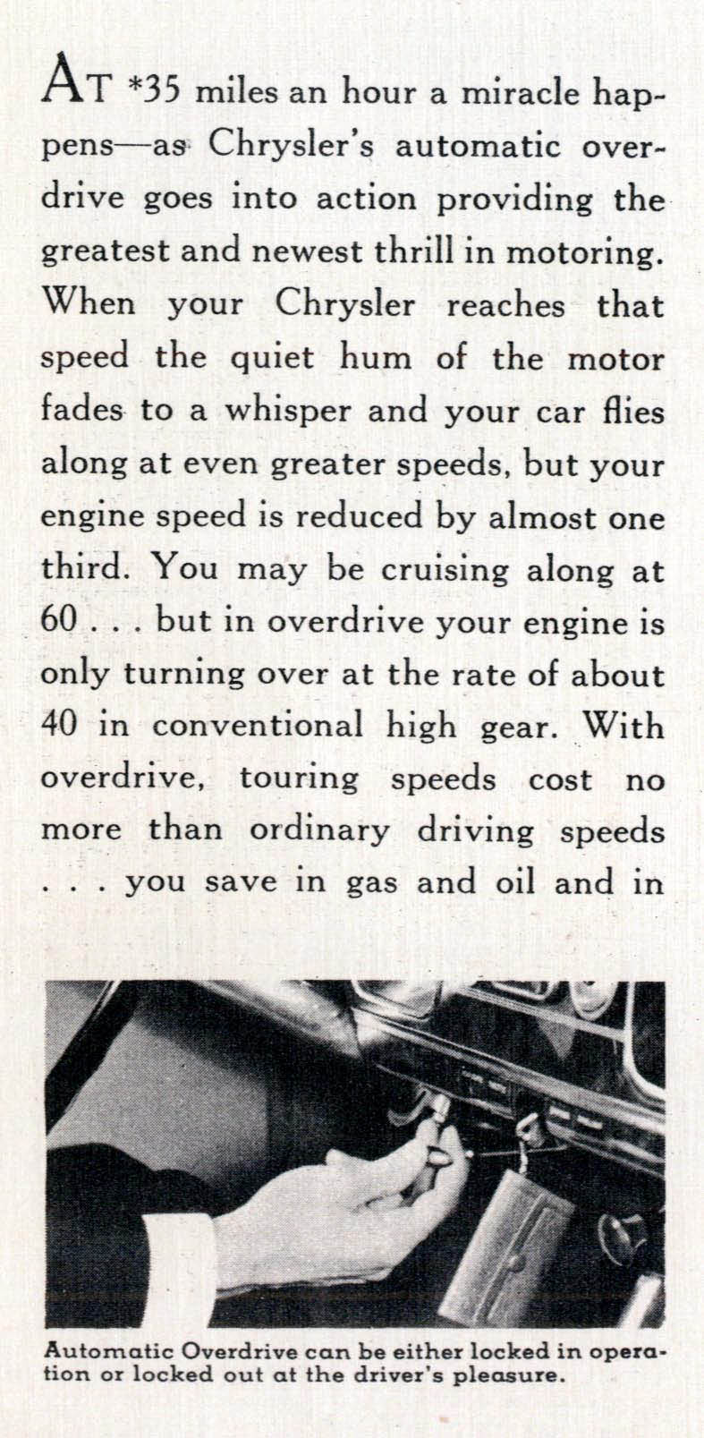 This 1937 brochure described the Chrysler Automatic Overdrive when "at 35 miles per hour a Miracle happens".
