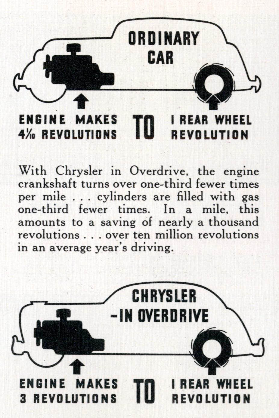 This feature changed the gear ratio in the transmission at 35 miles per hour improving the efficiency and economy of the engine. "You may be crusing at 60...but in overdrive your engine is only turning over at the rate of about 40 in conventional gear."