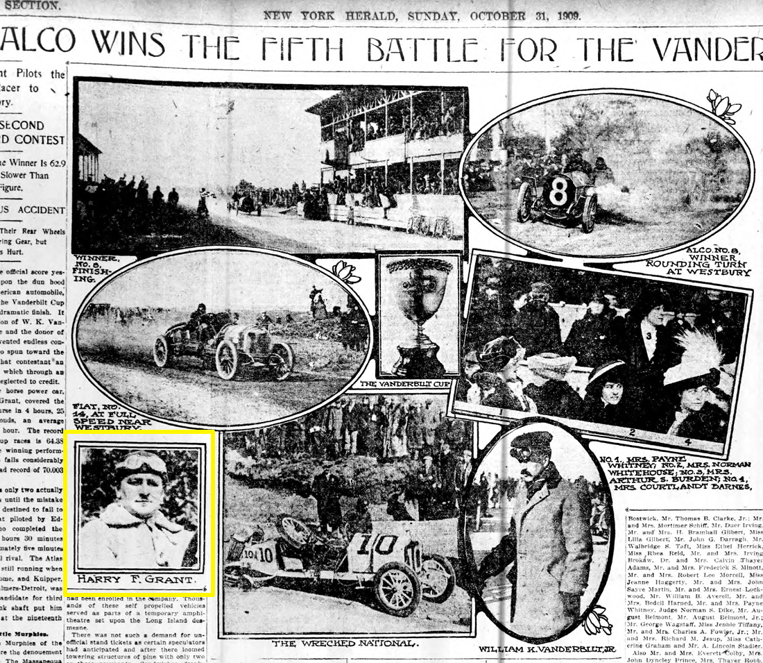 I very recently picked up a this photo of Harry Grant and was wondering if you might have any insight into where and when it was taken. I've seen a variation of this photo, cropped tightly on Grant's upper body and face turned to camera, used in at least a couple of newspapers alongside news of Grant's 1909 Vanderbilt Cup win.
