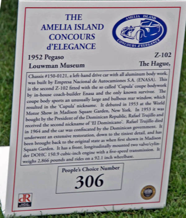 The Amelia concours has two Best in Show awards. This year, Best in Show Concours d’Elegance was awarded to a 1930 Rolls-Royce Phantom II town car with coachwork by Brewster, owned by Jack and Helen Nethercutt. Best in Show Concours de Sport went to the 1952 Pegaso Z-102 Cupola from the Louwman Museum in the Netherlands.