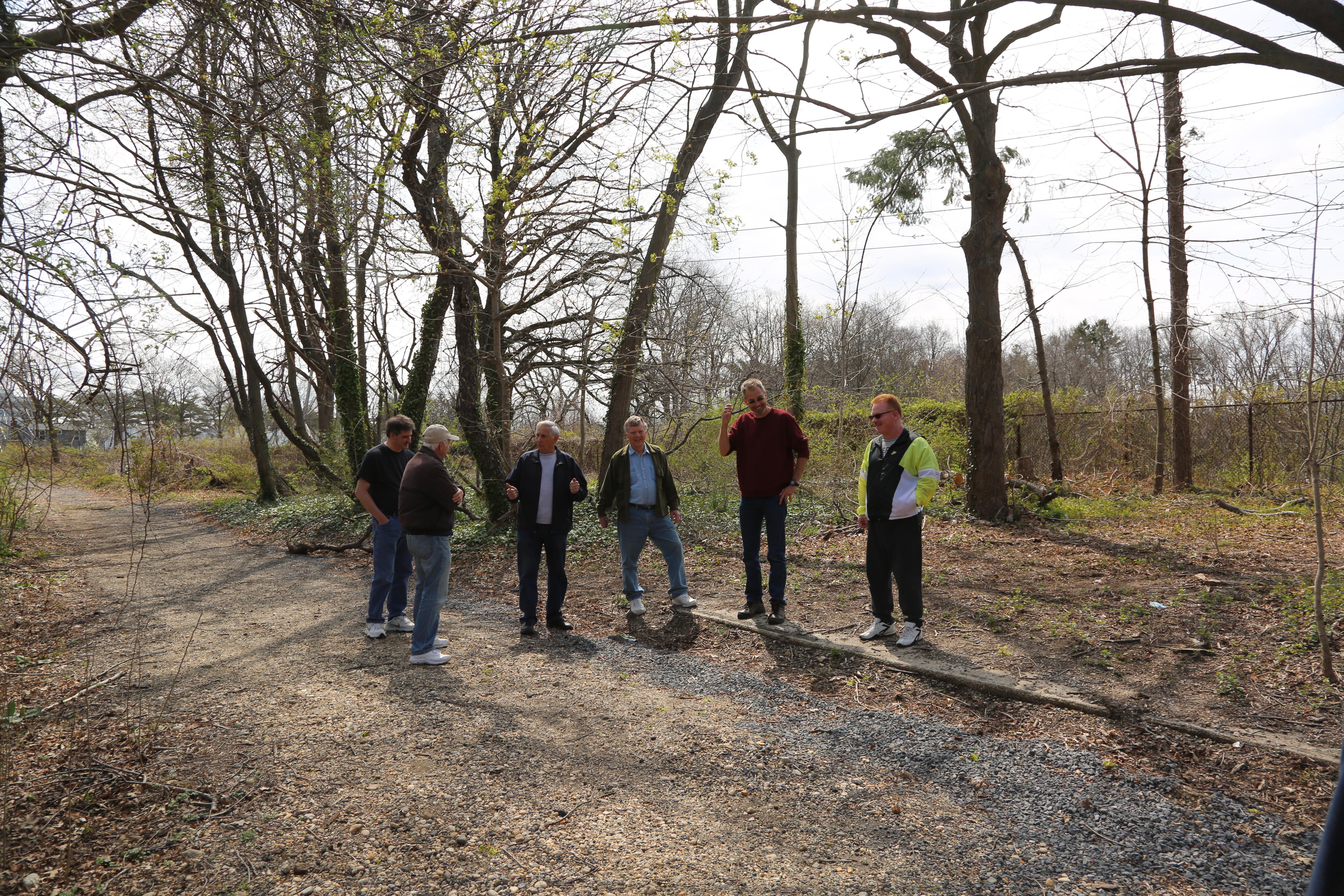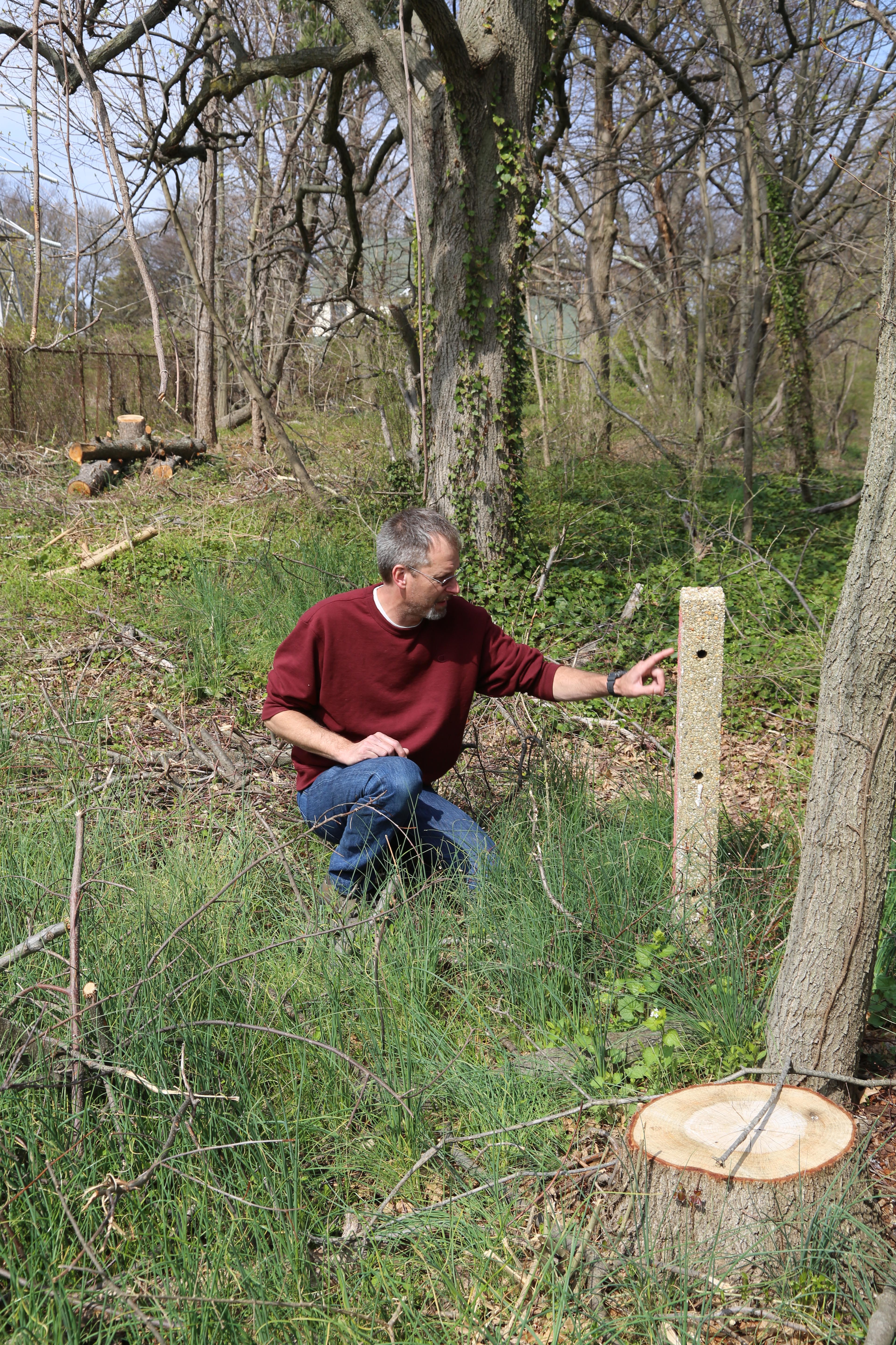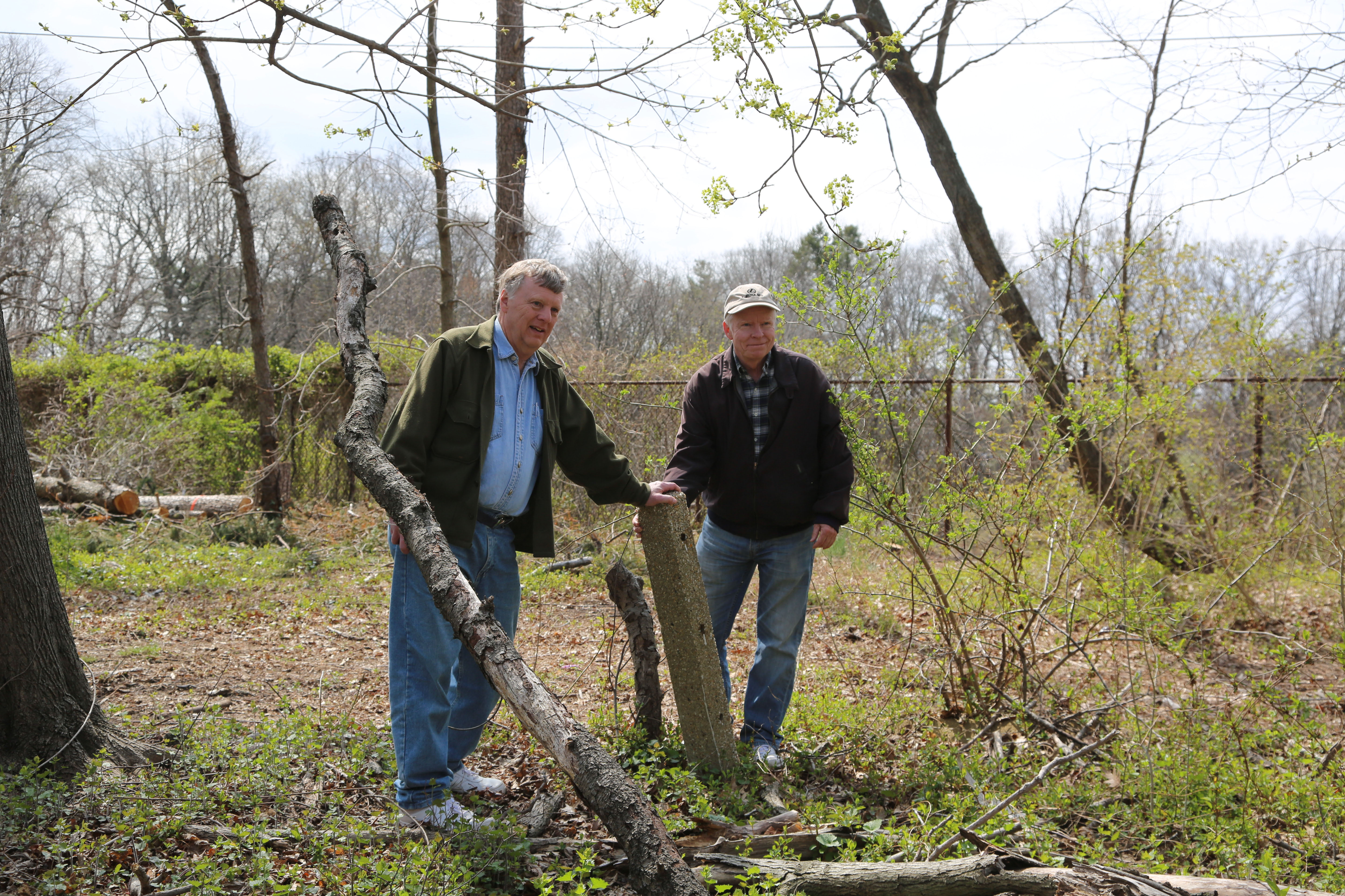 Sam Berliner III and Al Velocci with original cedar posts in the Battle Row Campgrounds in Old Bethpage.