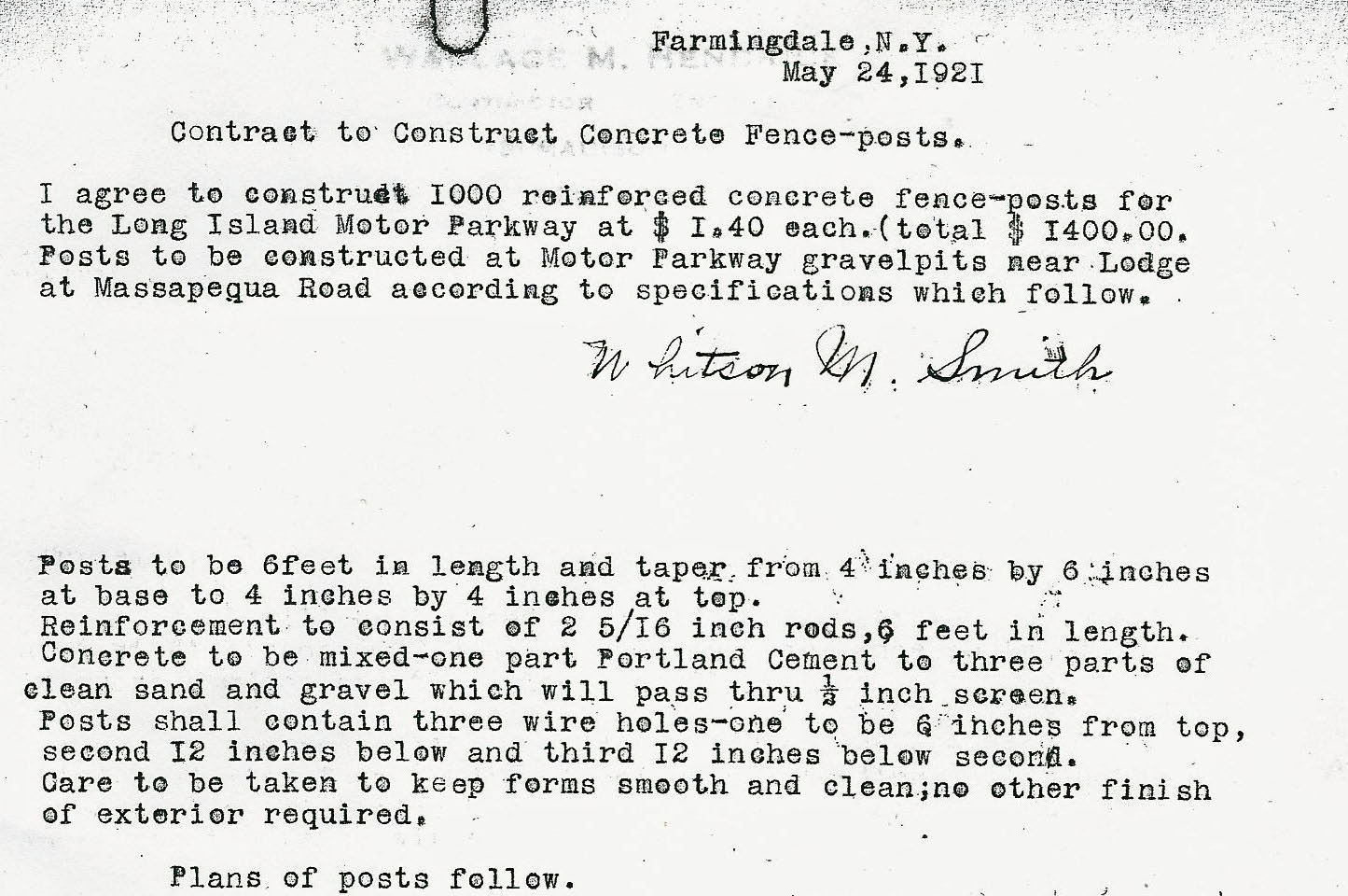 In May 1921 Whitson M. Smith received a contract to provide 1,000 reinforced concrete fence-posts at $1.40 per post.