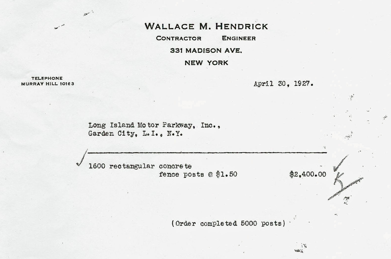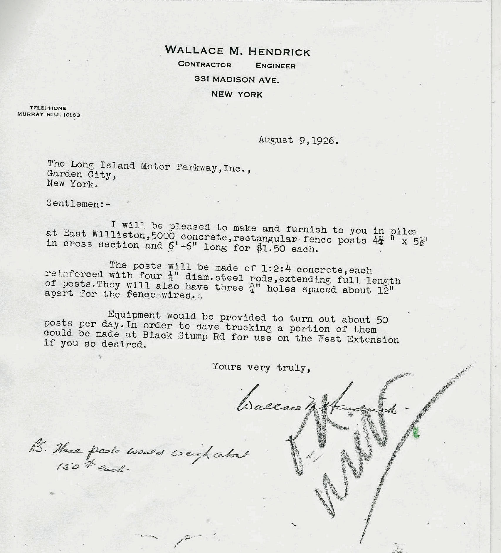 In 1926 with the extension of the Motor Parkway to Horace Harding Boulevard, an order of 5,000 concrete fence posts wer built by Wallace M. Hendrick for $1.50 per posts. Note: The contract was approved by WKV (William K. Vanderbilt, Jr.).