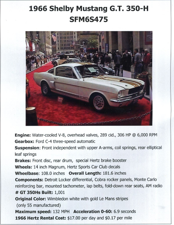 On June 5, 2003, I purchased my first collectible automobile -a 1966 Shelby Mustang GT350H at Christie's Collectors' Car Auction & Exhibition at Rockefeller Center, New York. I immediately began researching Shelby Mustangs and collecting Shelby Mustang memorabilia.
