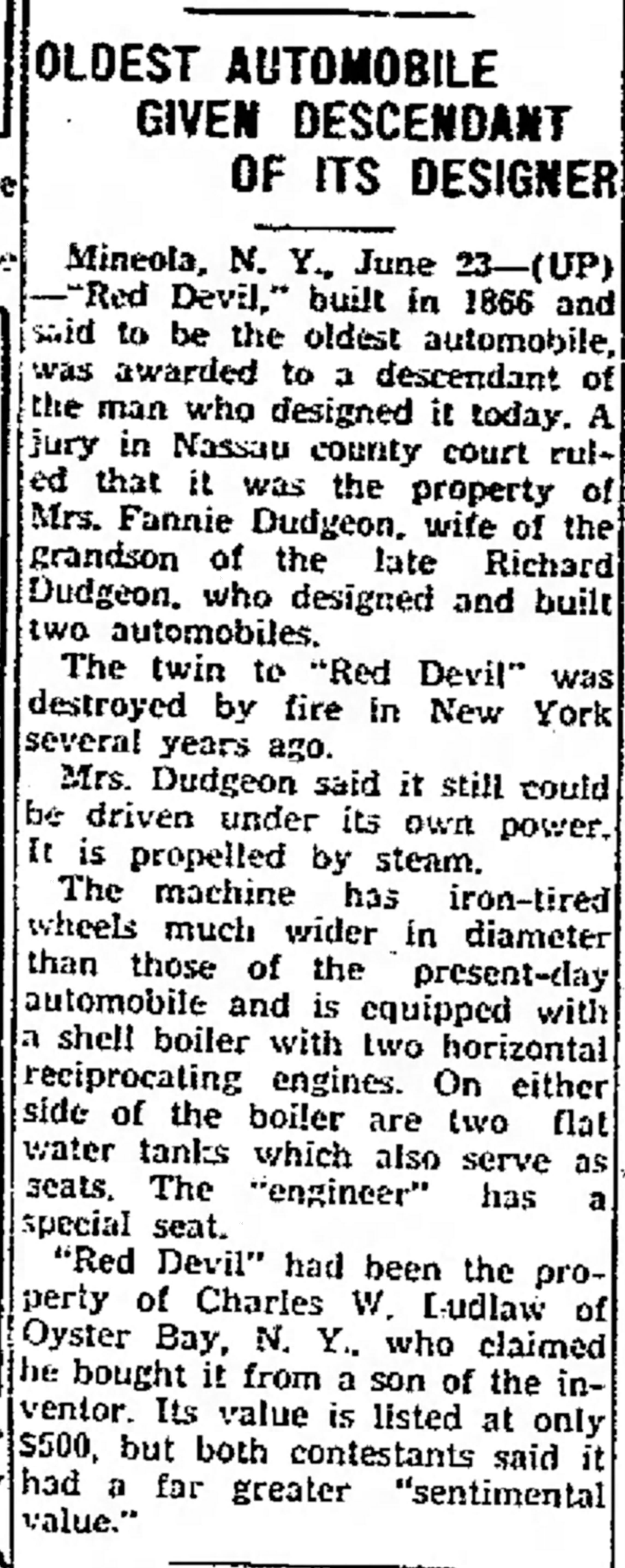 The April 1942 issue of The Bulb Horn republished a 1938 Herald Tribune article on a legal case concerning the Dudgeon "Red Devil" Steam Wagon with photos of how it looked in 1942. Thanks Gary Hammond and Art Kleiner for discovering the date of the Herald Tribune article.
