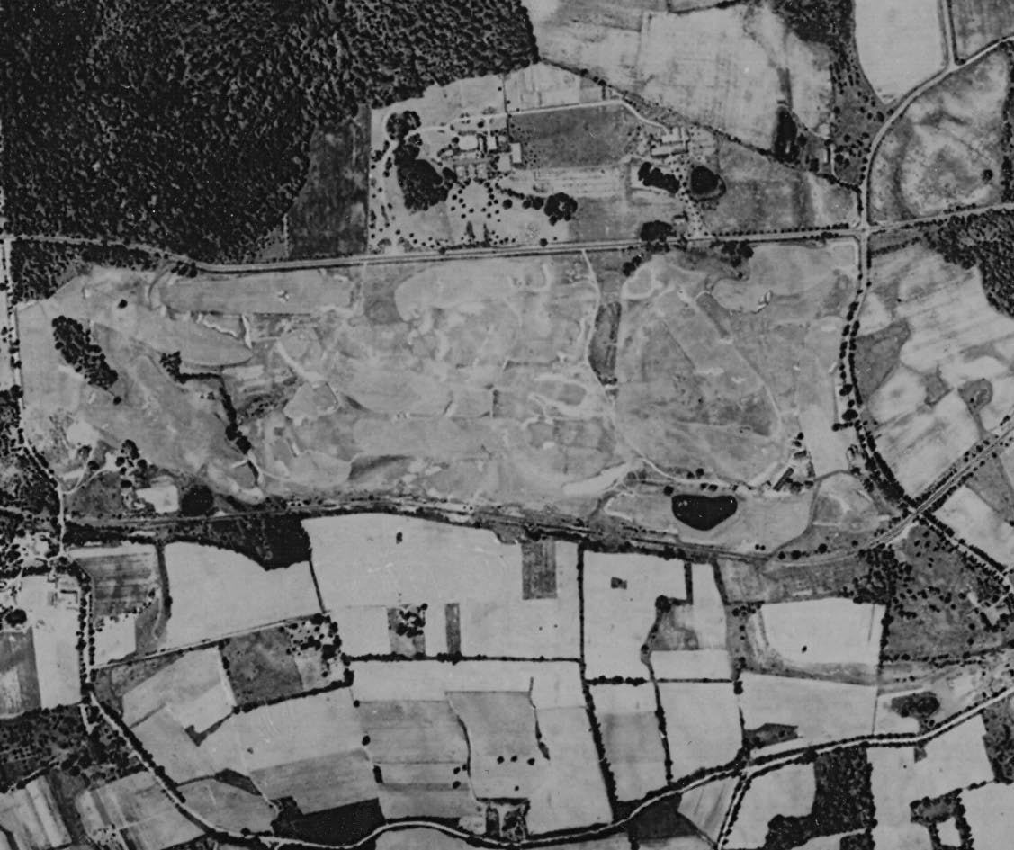 This 1940 aerial shows the Motor Parkway and the entrance to the Meadow Book Lodge on the left.