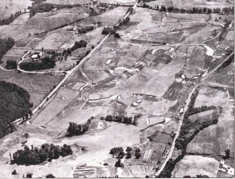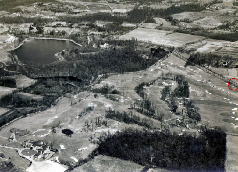 In this spectacular 1928 aeria, the clubhouse can be seen in the lower left corner. The Motor Parkway is adjacent to course on the right.. The Glen Oaks Club opened in 1925 and would move to Old Westbury in 1971.