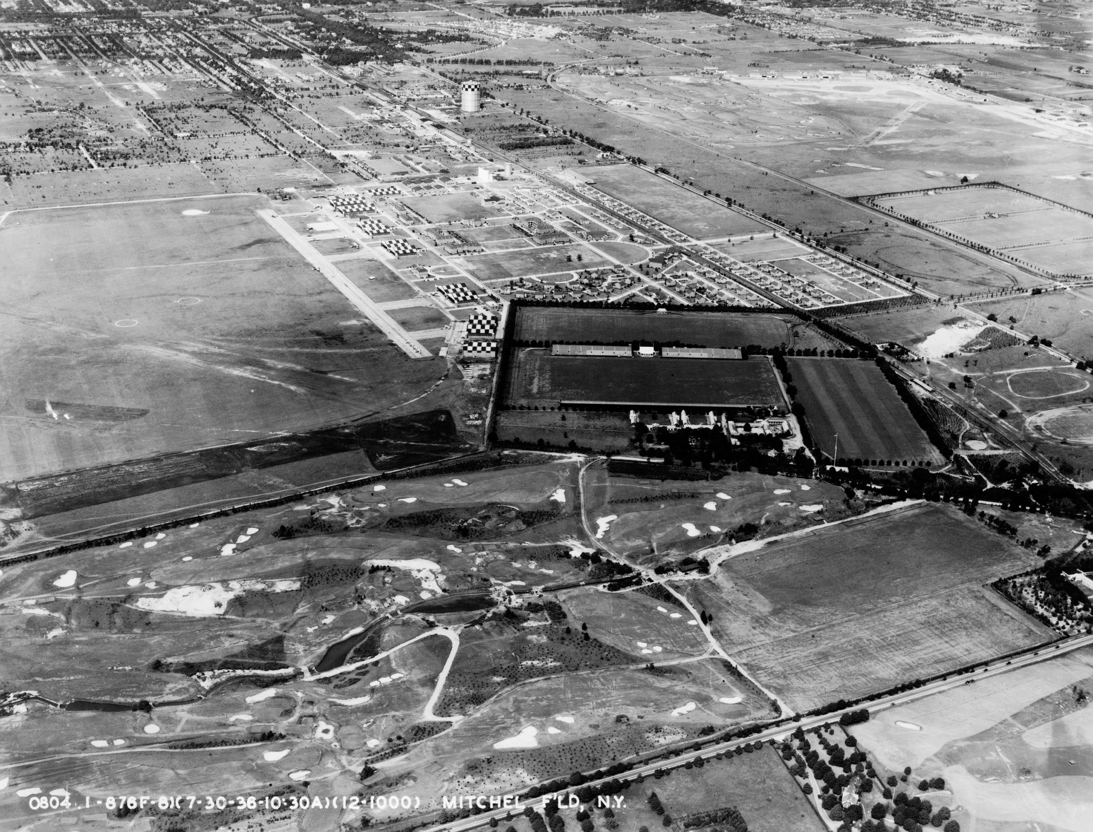 In this 1938 aerial of Mitchel Field, the Meadow Brook Polo Field and Meadow Brook Golf Club were also captured. The Coldstream Golf Club was located south of Hempstead Turnpike. Note the concrete runway of Mitchel Field was under construction reflecting the approaching World War. The Motor Parkway and a section of Roosevelt Raceway can be seen in the right corner.
