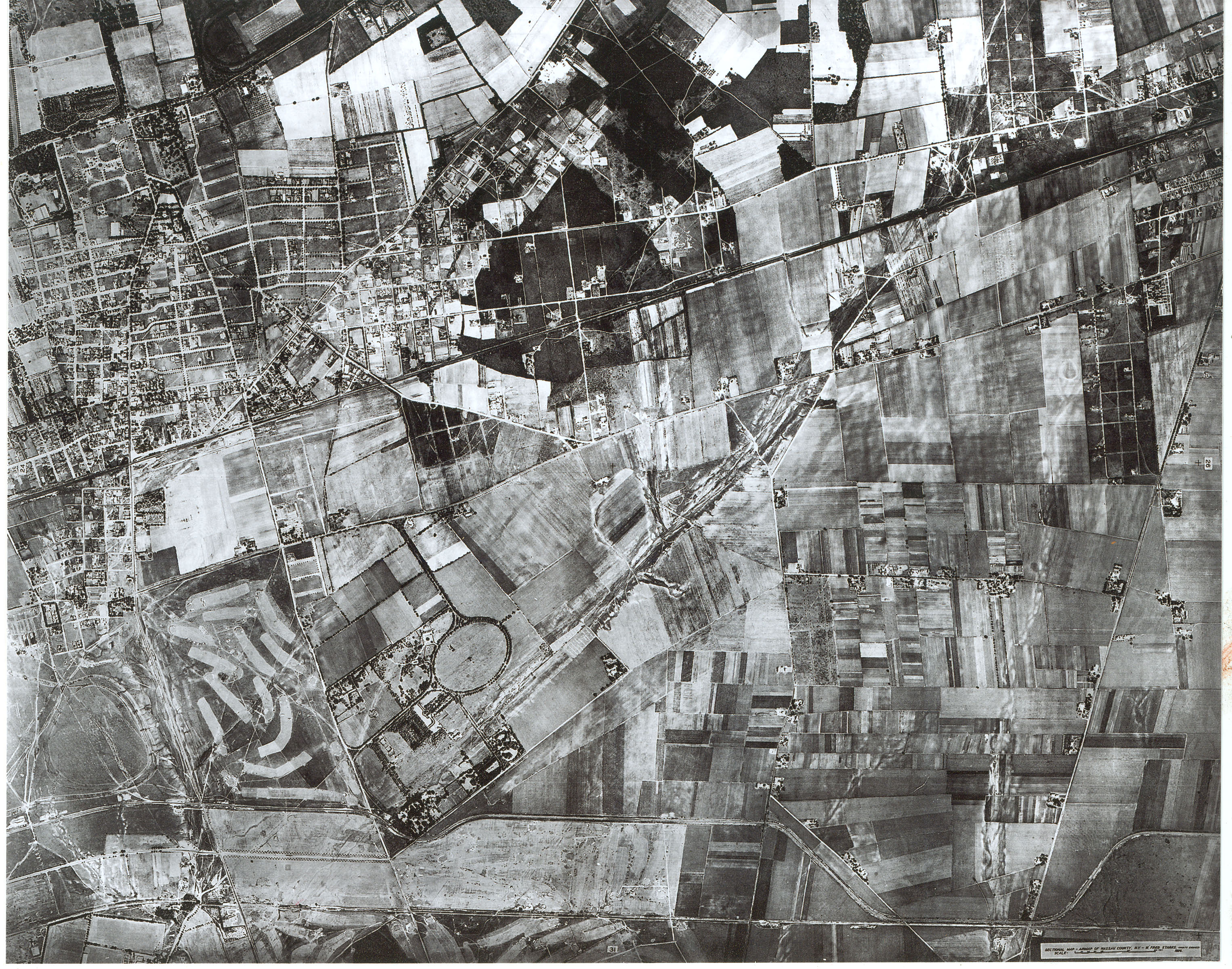 The Motor Parkway can be seen parallel to Stewart Aveue in this 1938 aerial filled with golf courses.