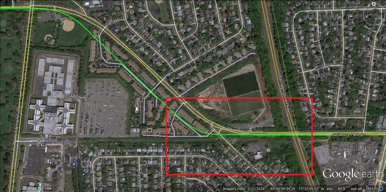 When you get a chance, Dave Russo; take a look at the Historic Aerials website. After viewing a 1966 aerial along with a 1947 topo; you’ll see the LIMP roadbed is just to the left/SE of Salisbury Park Dr between Carmen Ave and Old Westbury Rd. This makes sense of past visible LIMP remnants in this area before the building of the condo/apartment complex that is there presently.